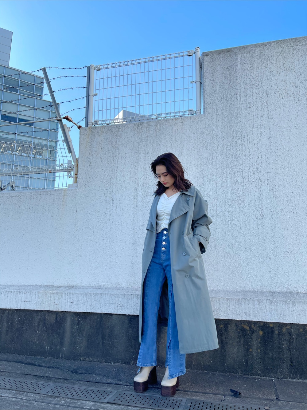 花島郁(EMODA)のトレンチコート「オーバーサイズトレンチコート」を使ったコーディネート