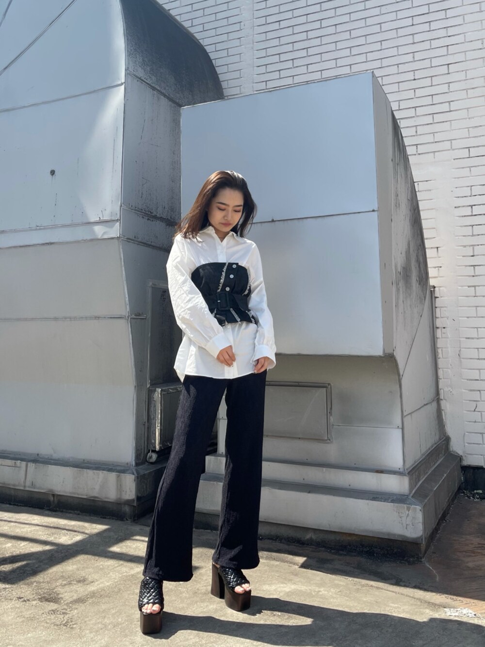 モノトーンだけどdenimとシャツを使って春っぽさをだしました♪シャツとビスチェがセットになったtopsは単品使いして頂いても可愛いので、とっても万能itemです❤︎春先はやっぱりデザイン性があるtops一枚でお洒落したいですよね❤︎ボトムもサラサラの生地感でシンプルなので、これから大活躍できるitemです!今回のコーデのitemは全て使い回ししやすい物なので、是非チェックしてみてください!
