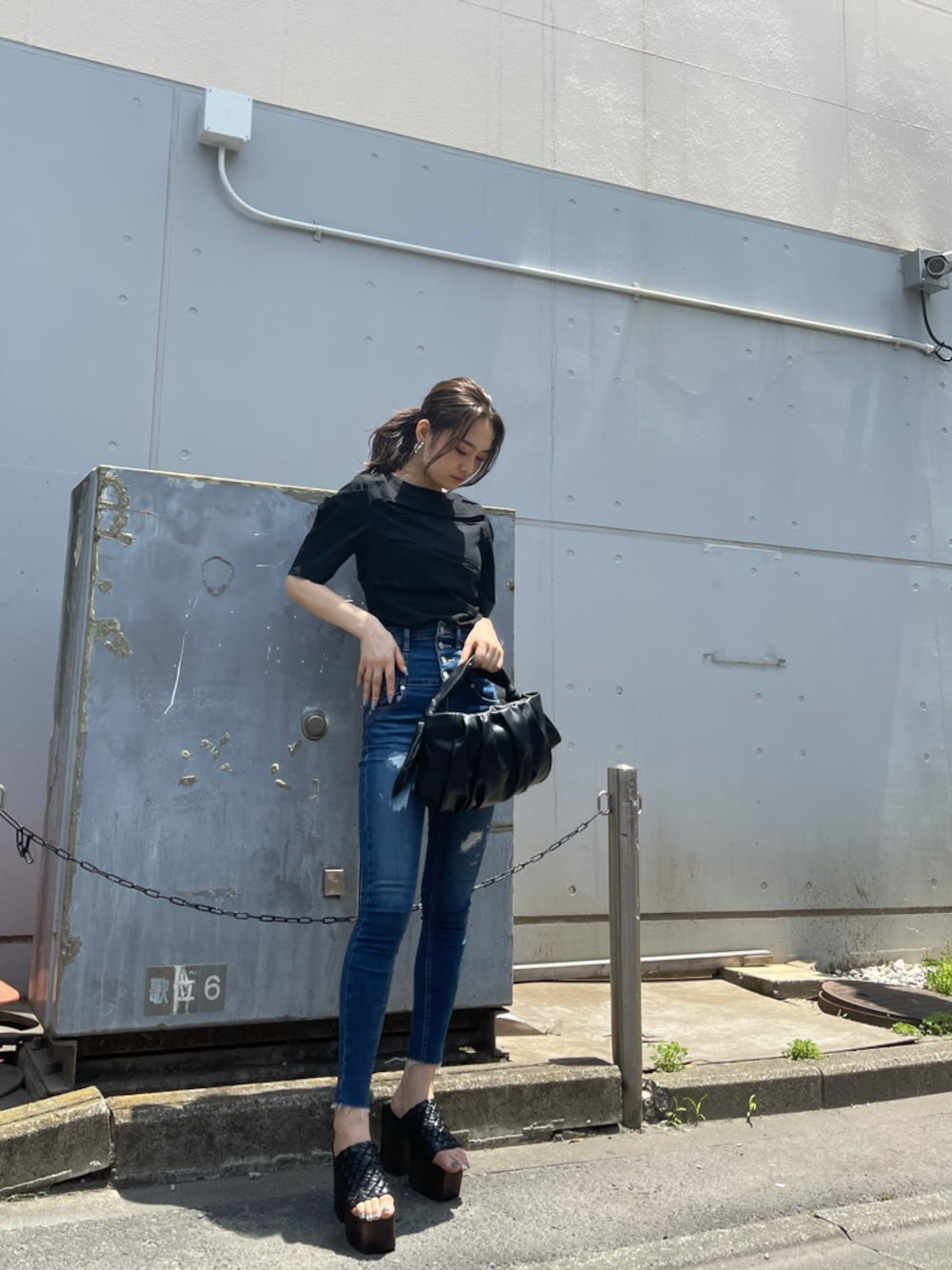 クールなdenimコーデ❤︎denim以外をブラックでまとめて、EMODAっぽくモードにしました!ブラックのtopsでもdenim合わせで夏らしく着れますよ♪こちらのtopsはシルエットがとてもおしゃれなので、シンプルなボトム合わせでもおしゃれして頂けます❤︎フィットしすぎず着やすくなっているこで、通勤着などにもおすすめです!denimはいつも通りのハイウエスト❤︎脚長効果抜群です♪明るめのインディゴcolorなので、細見えさせながら夏っぽい季節感も出してくれます❤︎まだ夏物買っていない方は是非Checkしてみてください♪