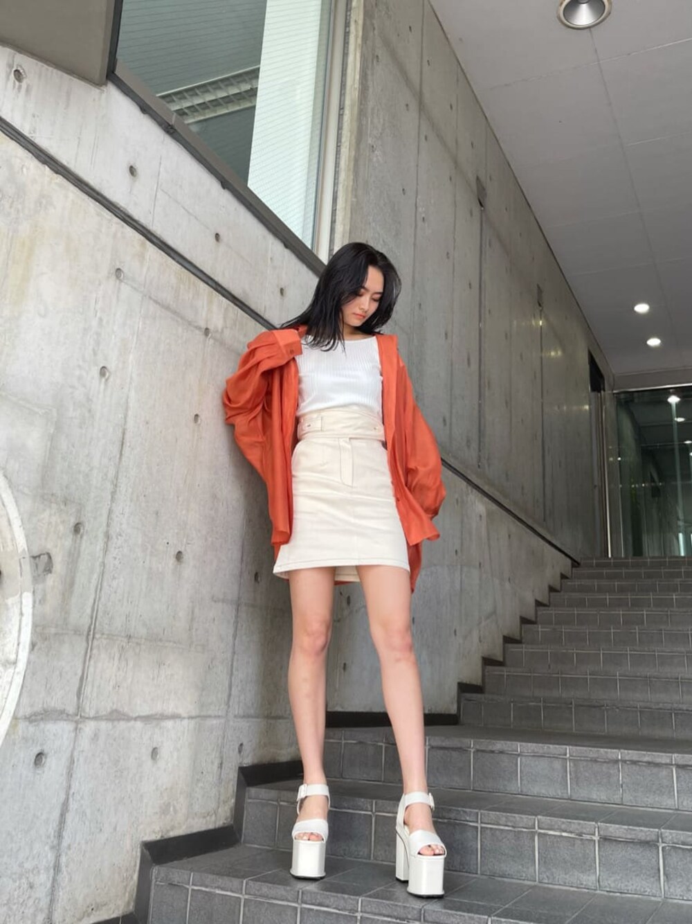 ビタミンカラーのシャツを主役にしたコーデ♡夏らしい元気が出るようなカラーシャツ♡他のitemをホワイトでまとめて、明るいカラーコーデにしました♪このシアーシャツは、高身長の私でもお尻まですっぽり隠れる丈感なので、スカート合わせでも細見えさせてくれます!スカートはかなりハイウエストなので、脚長効果抜群です♪デニムっぽいデザインになっていますが、伸縮性もあるのでかなり履きやすくなっています!ステッチのデザインも可愛いですよね♡足元は厚底shoesで合わせました♡shoesは合わせやすさなどでブラックを選びがちですが、ホワイトのshoesもとても合わせやすいのでおすすめです♡denimやカラー物と合わせると夏っぽいコーデになりますよ♪是非参考にしてみてください♪