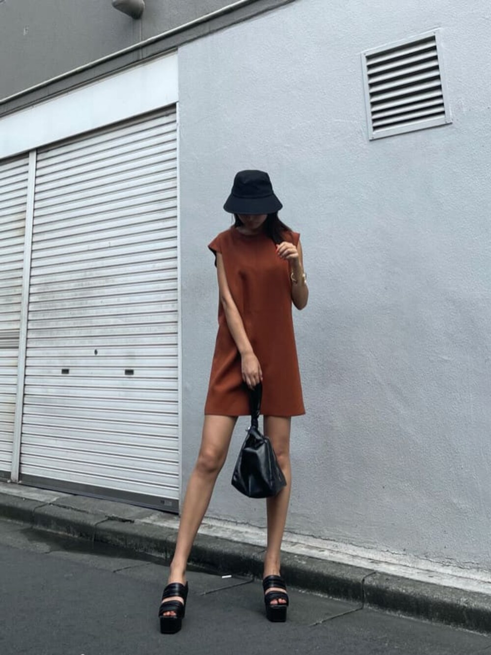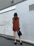 深いカラーの秋先取りコーデ!濃いめのオレンジなので、ほかのアイテムをブラックでまとめました!BOXワンピースはとてもお洒落に見えますよね♪生地ももちっとしているので着心地も抜群です!私みたいに高身長な方でもストンっと落ちるようなシルエットなので、短すぎずに着ていただけます!また身長が高い方でしたらマーチンなどのぺたんこシューズ合わせでも可愛いですね♪私は足を細見えさせたかったのでヒールで合わせました!このヒールはなんでも合わせやすい優秀アイテムです♡ワイドギャザーで足の甲が出すぎないので、ミニ合わせでもバランス◎です!ぜひみなさんCheckしてみてください!