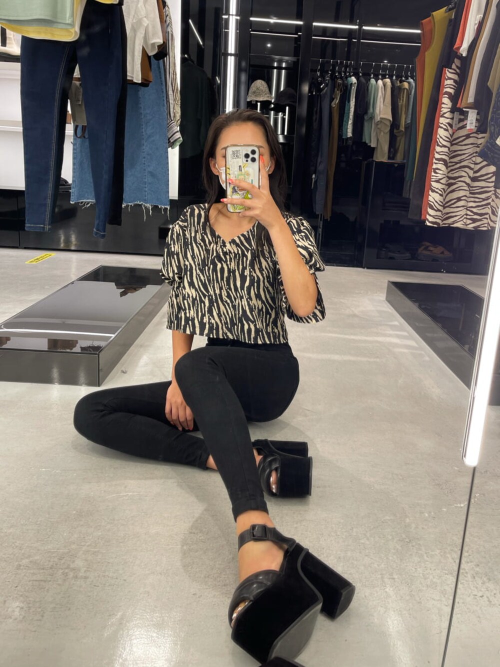 ゼブラ×ブラックの EMODAらしい強めコーデ♡袖の形がタックスリーブで一枚で着ても可愛いゼブラのトップスは、さらさらで薄め生地なので暑い夏にもってこいのお洋服です!私は夏でもモードコーデがしたかったので、他のアイテムをブラックでまとめました♪こちらのスキニーパンツは着圧ソックスみたいな締め付け感があるので脚やお尻を締め上げてくれます♡スキニーと厚底を一緒に合わせれば脚長効果抜群♡ハイウエストと高いヒールでこれでもかってくらい脚長にしてくれます!いつもの厚底にパッファーデザインがプラスされました♡珍しくボリューミーなデザインなので、細見え効果も!ぜひチェックしてみてくださいね♡
