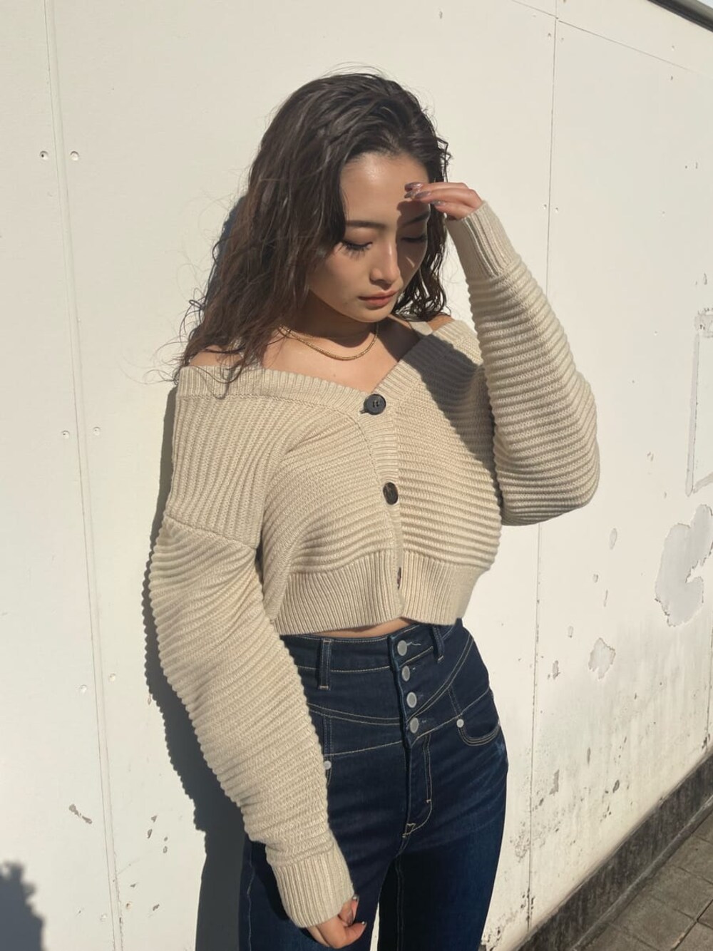 ザ! EMODAコーデ❤︎毎年大人気の2wayカーディガン❤︎今季のは少しボリュームがあるので、腰回りが華奢にみえるようになっています♪私は断然オフショルで着る派!EMODAっぽくてかわいいですよね♪ボトムに合わせたデニムは、ウエスト周りのステッチが斜めに入っているのでウエストがキュッとしまって見えるようになっています!また四つボタンでいつもよりハイウエストなのもポイント◎デコルテは出しているので、ブーツインで季節感を出しました❤︎みなさん是非参考にしてみてください!