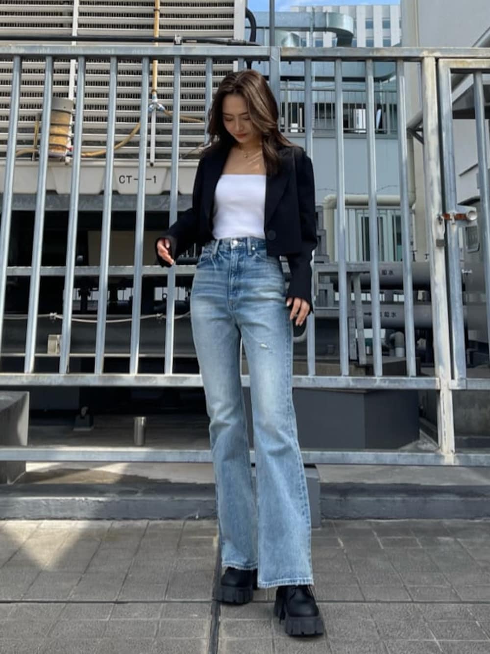 高身長さんにおすすめのコーデ❤︎【jacket】ショートの丈感が可愛いジャケット❤︎裾もカットオフになっていてワンポイントがきいてるのでシンプルすぎなくて可愛いです☺︎【camisole】昨年に続き今年も大人気のボックスキャミ!シルエットに無駄がなくシンプルさが可愛いアイテム☺︎私もリアルに2色買いました!笑【denim】高身長さんにおすすめデニム!私でも丈が長くて感動しました❤︎フレアの太さも細すぎず程よいので、骨盤が気になる方にもおすすめのパンツです!【shoes】ソールが可愛いこちらのブーツはワイドパンツや、フレアパンツ合わせもおすすめです☺︎見た目とは違ってびっくりするくらい軽いので、スニーカー感覚で履いて頂けますよ❤︎