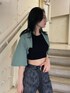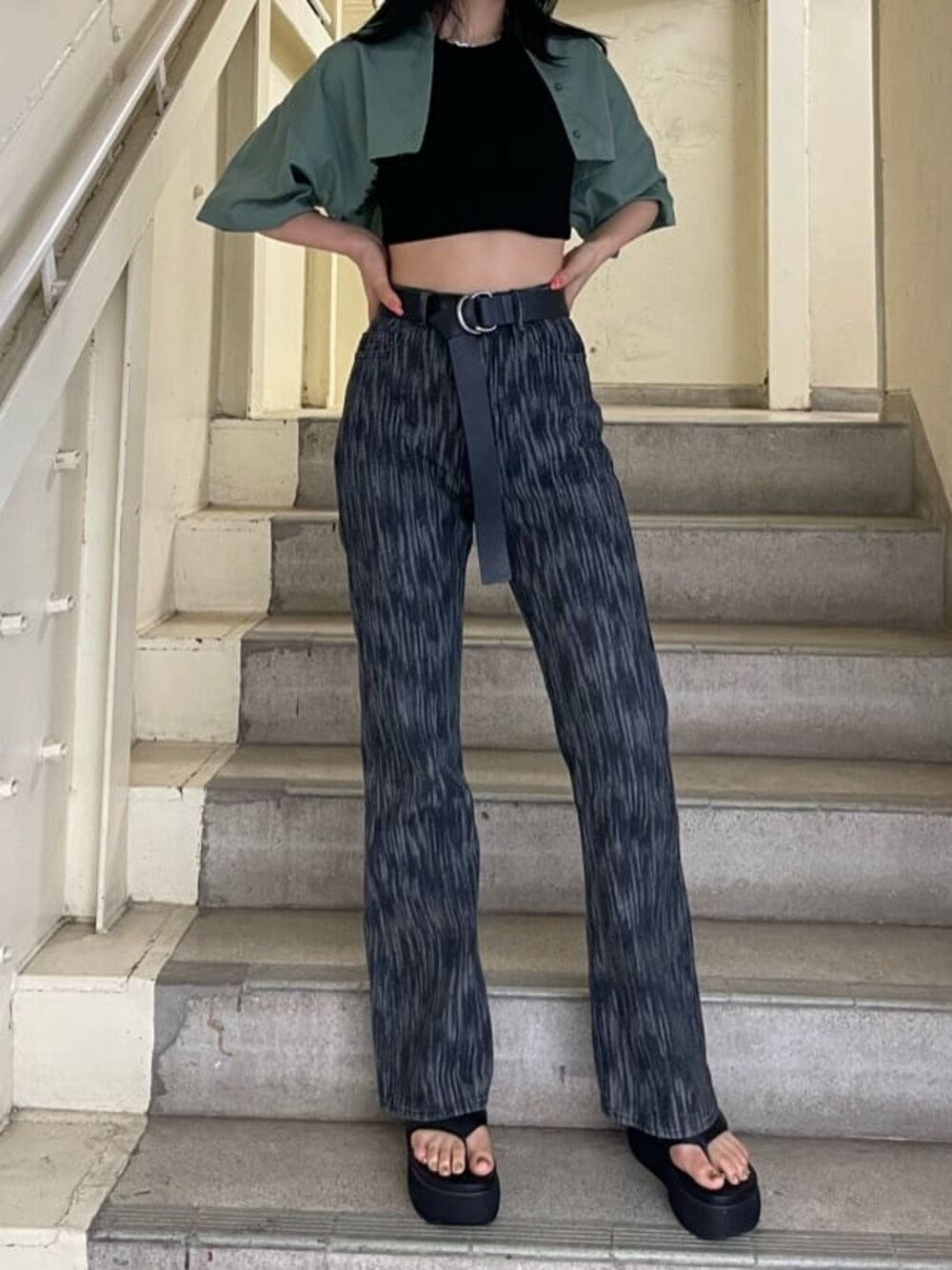モードカジュアルコーデ❤︎【シャツ】かなりのクロップド丈なので脚長効果抜群です!どの身長の方が着ても胸くらいの丈感で着ていただけます!【デニム】柄が珍しいフレアデニム!シンプルなコーデに合わせると一気におしゃれ見えします。167センチでSサイズ着用でギリギリ床につかないくらいです。【シューズ】夏らしいデザインのフラットな厚底サンダル!24.5-25センチでLサイズ着用です。