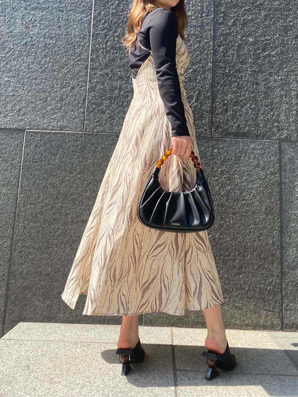 今年の春夏のマストアイテム、キャミワンピは、レイヤードする事で今の時期から着ることができ、様々なテイストのコーディネートに変化させることもできます◎ ワンピースは上がぴったりで、高めの位置から広がるシルエットなので腰回りカバーしてくれて、脚長効果も期待できます✧︎生地感軽めなので、スカート部分の風になびく感じがすごく可愛いです♡ 今回インナーとして合わせたロンTは、首元が広めなのでデコルテ周りを綺麗に見せてくれて、ショート丈なのでワンピースのインナーとして使用してもかさばらずに着て頂けます!暖かくなってきてお出かけする機会も増えるので、今回は少しきれい目コーデを目指して、インナーがTシャツで少しカジュアルなので、靴はヒール、BAGもフェイクレザー×べっこうで大人っぽいコーデにまとめてみました!スニーカーや、ショートブーツ合わせにするとカジュアルなコーデに変化することもできます!是非春のお出かけの参考にしてみてください♪