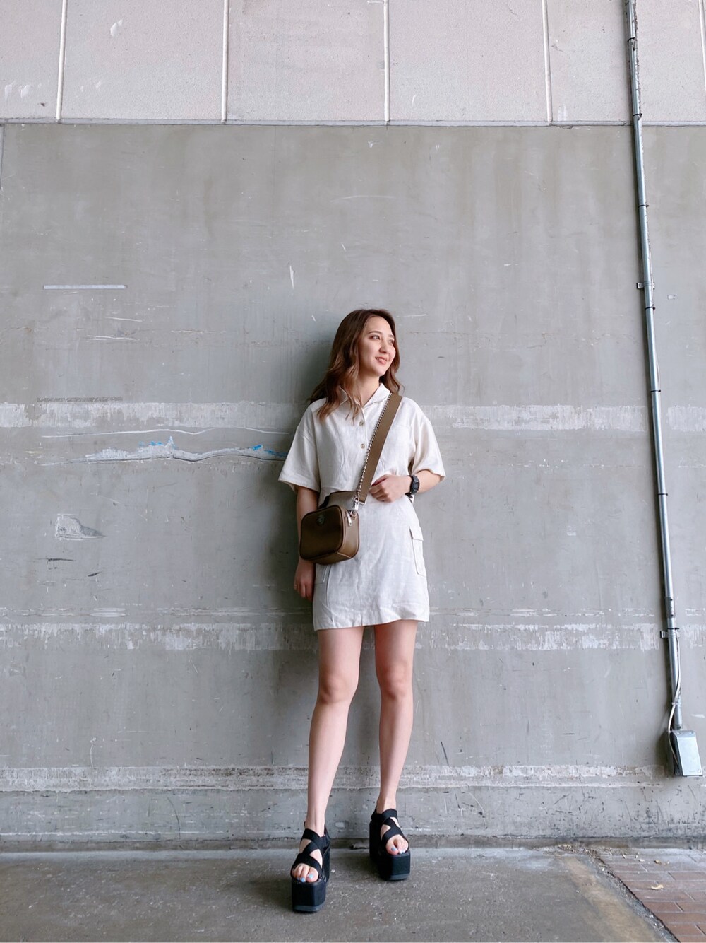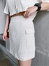 着回し抜群!SET UPコーデ♡ セットでも別々でも人気なこのSET UPは、リネン生地で、暑い日でもサラッと着こなすことができ、チクチクしない柔らかい生地感なので、着心地も抜群です◎ TOPSは、シャツタイプで前が長め、後ろは少し長くなっている為、短すぎず、ハイウエストのボトムスと合わせも綺麗に着こなせるシルエットです!前開きで羽織としても使えて、袖がゆるっとしていて、少し長めの作りなので、二の腕が気になる方はタンクトップなどに羽織としても使える1枚です☺︎ スカートは、台形型で、インナーショーパン付きなので安心して履いていただけます✧︎サイドポケットが着いているデザインなので、シンプルなTシャツやブラウスと合わせるだけでもオシャレに見せてくれる1枚です◎163cmの身長だとSサイズは少し丈感短く感じたので、Mサイズで履くと丁度いい丈感で着れました♡ リネンの生地は、少しシワになりやすい素材なので掛けての保存がオススメです☆ アイボリーで涼しくコーデを組んでみましたが、ナチュラルになり過ぎないよう、足元はスニーカーサンダルで締りを出し、BAGは同系色のブラウンを選び、小物でEVRISらしいコーデに仕上げました◎