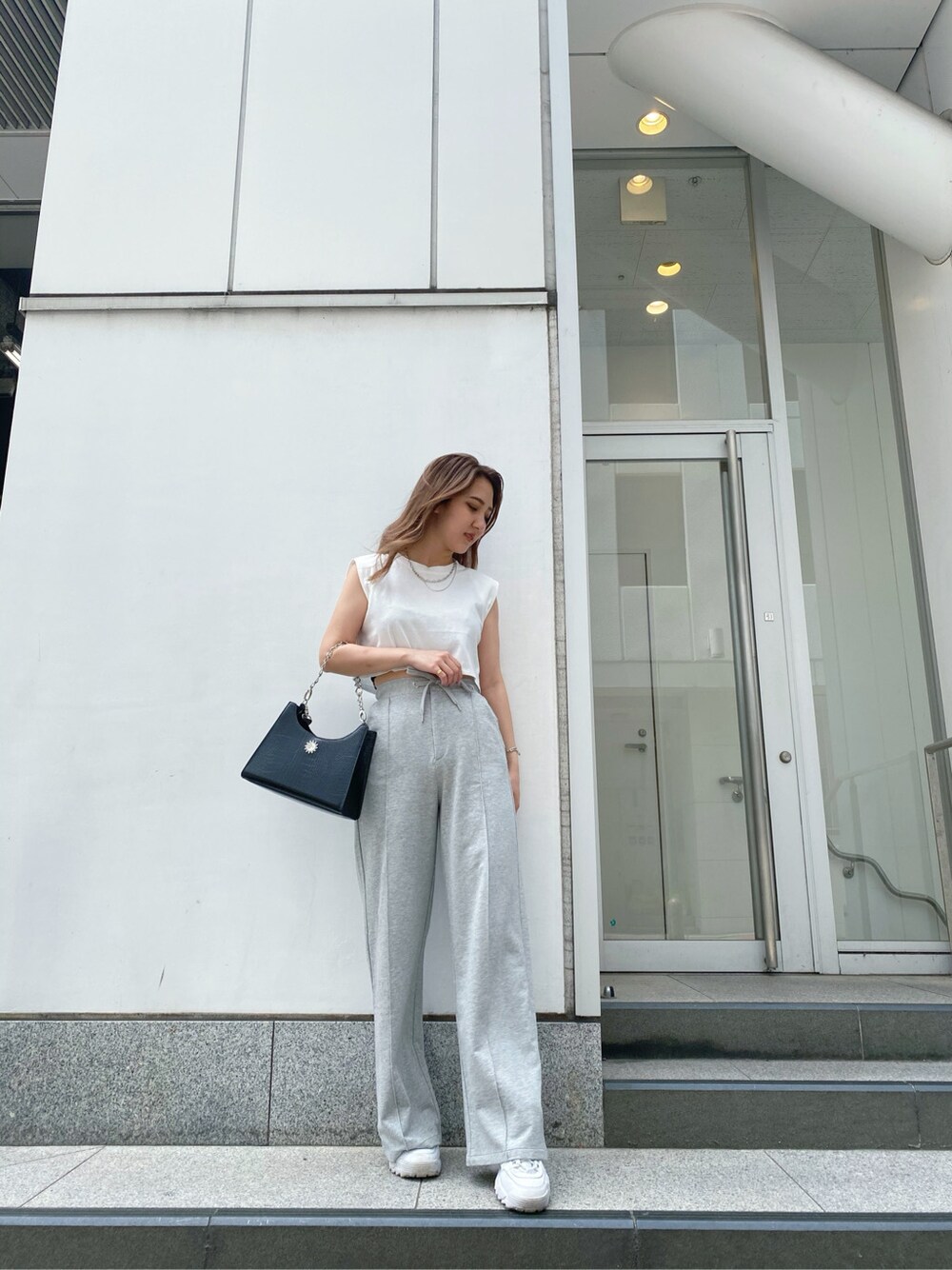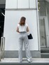 楽にオシャレができるリアル私服コーデ♡ 私がリアルに着ている、デイリー使いしやすいアイテムを使ったこのコーデ、TOPSは肩パットが入っていて、なで肩でタンクトップやキャミソールがかっこよく着れない私でも、着てみて感動したアイテム!二の腕も細見えするので本当にオススメです!丈感短めなのでハイウエストボトムとの相性抜群◎ 今期トレンドのスウェットパンツは、ウエスト部分の後ろ側はゴムで着やすく、フロント部分はゴムになっておらず、紐できゅっと絞れるので、メリハリが付き、ウエスト周りだぼっとならずに履けます!先端にラインが入るので、ストレートのシルエットをより綺麗に見せてくれて、スタイルアップできるスウェット中々ないので、スウェット選び迷ってる方には是非一度試して見て欲しいパンツです!カットソーにスウェットパンツでシンプルなコーデなので、アクセサリーは、シルバーアクセを合わせて、1ランク上のストリートコーデになるようにしてみました!シルバーアクセと合わせて、BAGもシルバーチェーンの綺麗めBAGを選びました!通勤コーデなのでスニーカーを合わせましたが、厚底サンダルや、ミュール合わせだとラフになりすぎないコーディネートにすることも出来るので、シーンに合わせて小物を変えるのがおすすめです!