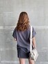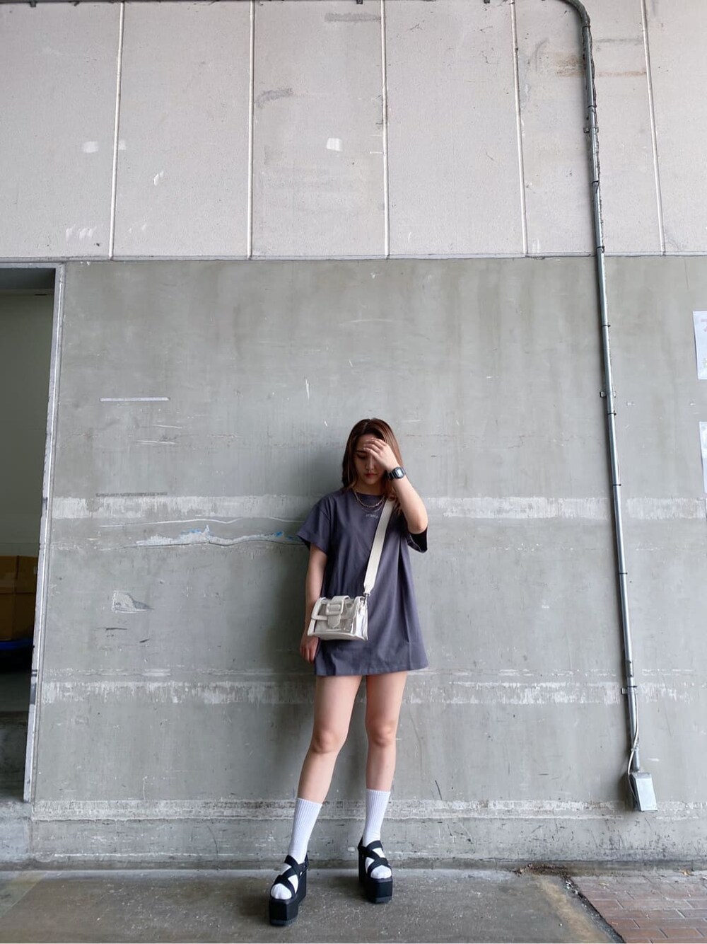 夏にしたいスポーティーコーデ♡ EVRIS初のロゴTは、オーバーサイズなので、163cmの私でもおしりすっぽり隠れて、ワンピース風に1枚でサラッと着れます◎ さり気ないEVRISロゴと、ロールアップの袖のデザインが可愛いくて、何よりチャコールグレーの絶妙な色味が、他のブランドのロゴTには中々ない色味で、シンプルながらオシャレに見えてお気に入りです♡ このサイズ感なので、EVRISっぽくウエストにベルト巻いてフレアパンツ合わせなども可愛いです!Tシャツだけだとシンプルなので、2連のゴールドのネックレスを合わせてストリート感をプラスし、足元はスポーティーコーデには欠かせないスニーカーサンダルを合わせました!スニーカーサンダルは、ミニ丈と合わせる際靴下履いてあげても可愛いです☺︎ 全体的に暗めのカラー合わせなので、BAGはクリアのホワイトで明るく夏らしさを出しました✧︎ さらっと着れるコーデなので、通勤やおでかけ、夏は海など行く際にもおすすめです♡