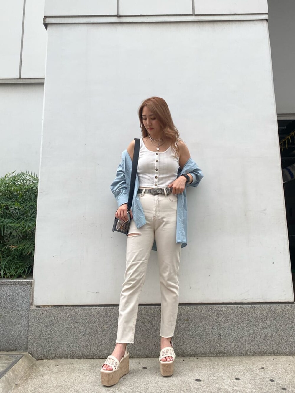 ブルー×ホワイトで爽やかコーデ♡ バックシャンのシャツは、生地感薄めで夏の羽織にもちょうどよく着れます◎ 163cmの私でもおしり隠れる丈感なので体型カバーも出来て嬉しい1枚☺︎ インナーのタンクトップは、ボタンデザインが可愛く、1枚ではもちろん、インナー使いにもおすすめです!クロップド丈なのでハイウエストのボトムスとの相性も抜群✌︎︎ デニムは、アイボリー寄りの色味で、ブラウンステッチが入っていて、普通のホワイトデニムよりオシャレなだけじゃなく、膨張せず着る事ができ、下着が透ける心配もないので安心して履けます◎ カッティングが高めの位置になっている事で、脚長効果も期待できます♡ コーデに合わせてサンダルもホワイトでBAGはクリアバックを選び、締りが出るようブラックにしました!3wayで使えて中のポーチ外すとブラックの主張強すぎず使えるのでおすすめです✧︎ 露出少なめで日焼け対策にもなるので、外のお出かけにもおすすめなコーデです♡