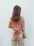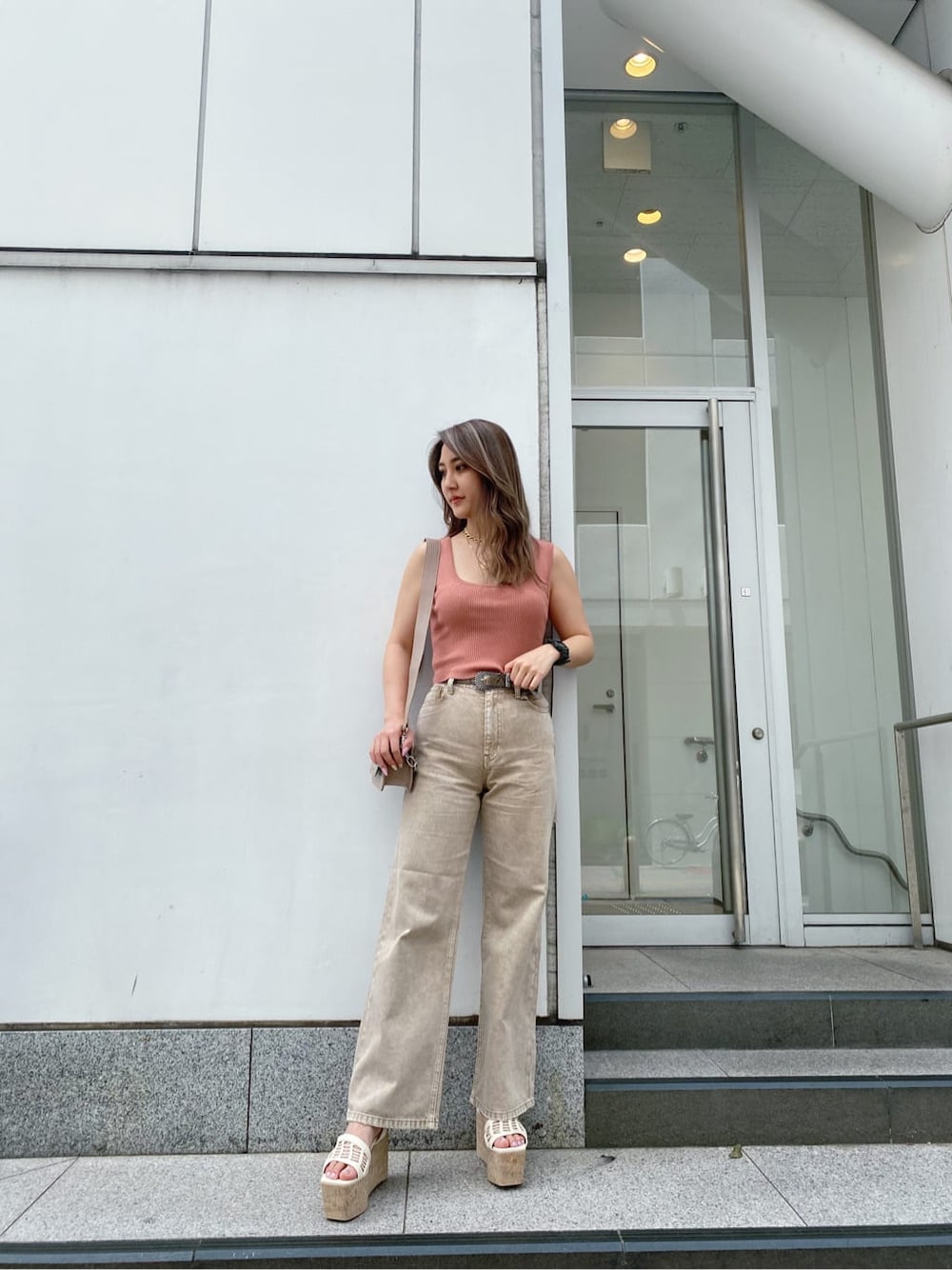 後ろ姿まで映える、EVRIS定番コーデ♡ EVRISといえばの、バックリボントップスとバックスラッシュデニムのバックシャンアイテム!TOPSは、サマーニットなので涼しい素材感で暑い日でも着やすいです!スクエアネックでデコルテを綺麗に見せ、後ろのリボンをキュッと絞ることでウエストライン細く見せてくれます✧︎甘くならないピンクの色味が可愛いです♡デニムは、今までのバックスラッシュデニムより少し生地感薄めになっていて、柔らかいのでなじみやすく、夏でも履きやすいデニムになっています!ウエストラインを強調しつつ、気になる部分は隠してくれる、すっきりラインのワイドシルエットが細身え効果抜群◎163cmの私でSサイズを履いて丈感すっきり着れるので、高身長の方で長めの丈感がお好みの方はMサイズにしてベルトでウエスト調節するのもおすすめです!薄目のベージュなので色物トップスと合わせても可愛く着れます♡小物は馴染むようにベージュやホワイトを合わせました!写真映えするコーデなので、カフェや、旅行などお洒落したい場面におすすめのコーデです☺︎