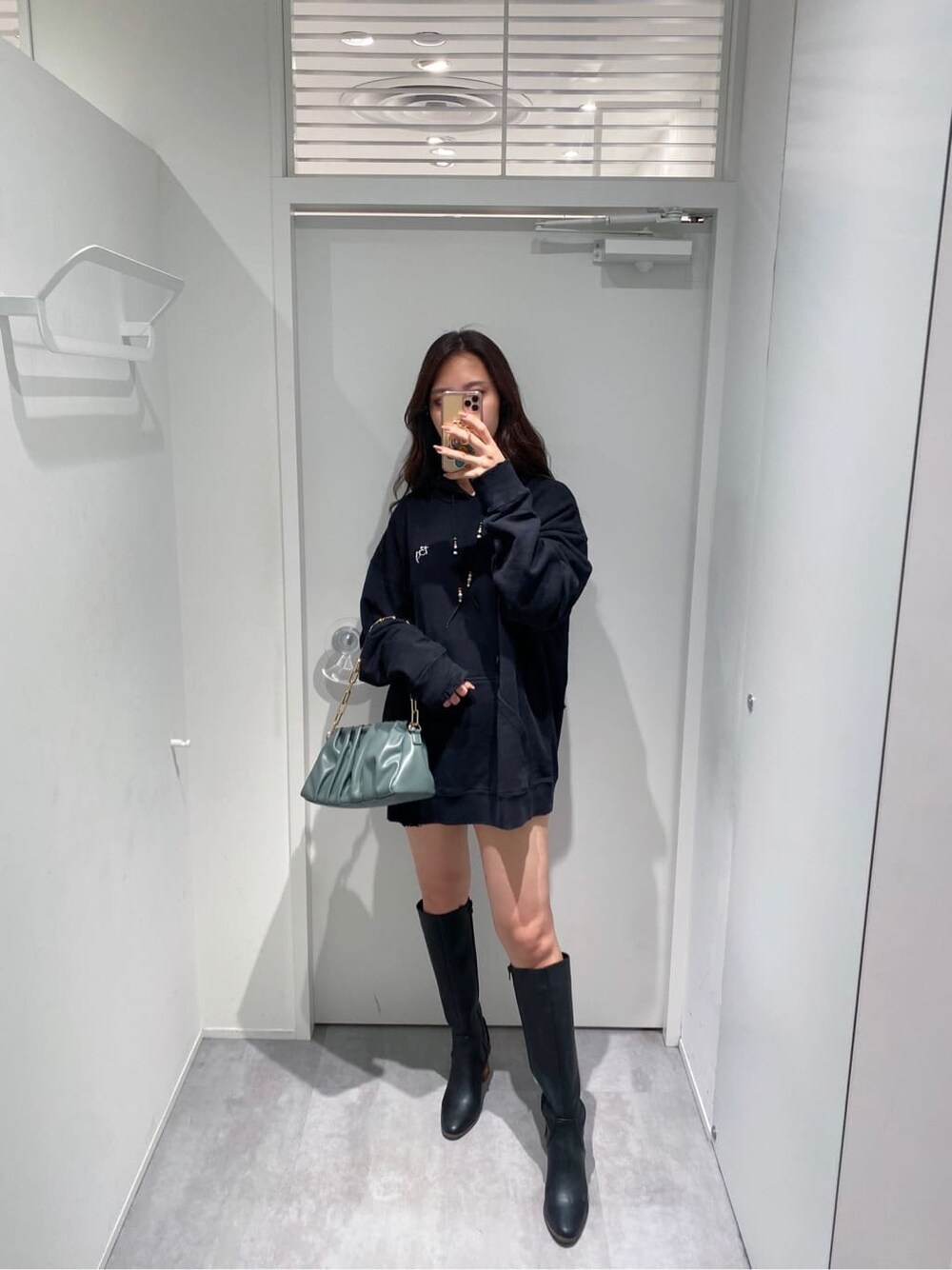 B.Iコラボアイテム♡ 予約、お問い合わせ殺到のBIさんコラボのフーディです☆ 163cmの私でもワンピース風に合わせられる丈感で、メンズの方でもゆるっと着れるユニセックスアイテムになっています◎ 生地感しっかりめなので、中に着込んだり、羽織合わせたりでこれからの季節はもちろん、裏起毛では無いので春先まで長く着用して頂けます!胸元のロゴや、紐のデザイン、所々ダメージ加工も入っていて、オシャレに決まるデザインになっていて可愛いです♡ワンピ風に着る際は、EVRISのデニムショーパン履くのがおすすめです✧︎ 丈感短めのスッキリシルエットなので、フーディの中にすっぽりおさまります◎ ショーパンでワンピ風以外にも、フレアパンツで合わせたり、BIさんみたいにゆるっとしたパンツを合わせて、よりカジュアルなストリートコーデにしたり、色んな雰囲気で気分に合わせて着回せちゃいます✌︎︎ 私はフーディ×ミドルブーツの組合わせが好きなので、このコーデで合わせました!カジュアルですが、BAGを少し綺麗めのカラー物を合わせて、女性らしく、よりEVRISっぽい着こなしにしました◎ 大人気アイテムなので完売前にぜひGETしてくださいね!!