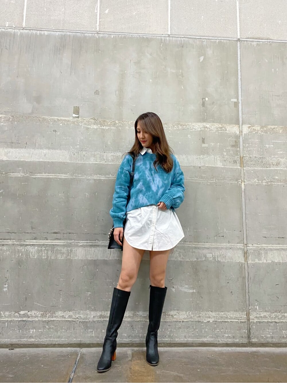 着るだけで映えるタイダイ柄ニットコーデ♡ EVRISらしい色味が可愛いタイダイ柄のニットは、パキッとしすぎないタイダイ柄と派手すぎない色味で、コーデに採り入れやすい柄アイテムになっています◎ 柔らかくチクチクせず、毛玉もできにくい素材感なので、春先まで長く愛用していただけます♪ 少しだけ前が短い丈感になっているので、ハイウエストのボトムスとの相性も抜群です!少しゆとりのあるサイズ感なので、今年トレンドのニット×シャツのレイヤードコーデもおすすめです♡ シャツは今からの時期はニットやトレーナーとレイヤードしたり、中にタートルトップスを合わせて着たり、季節の変わり目には羽織としてでも使えたりと、1枚あると無限に着回しできちゃう優秀アイテムです!163cmの私でもワンピース風に着れちゃう丈感です︎︎︎︎✌︎ ミドルブーツで合わせて、季節感をプラスしました◎ このブーツはすっきりシルエットですが、履き口隙間ができる作りなので、脚を細く真っ直ぐ長く見せてくれて、美脚効果抜群です☆ヒールも安定感のある太めのヒールなので走れちゃうくらい歩きやすいです♪ BAGは主張しすぎないさり気ないデザインが可愛いショルダーバックで、バランスを取りました! ショルダー取り外しが出来るのでハンドバックとして使うのも大人っぽくなるので気分に合わせて使い分けるのもおすすめです!トレンドを抑えつつ個性的に楽しめるコーデなので、女子会やお出かけの日などにもおすすめです♡