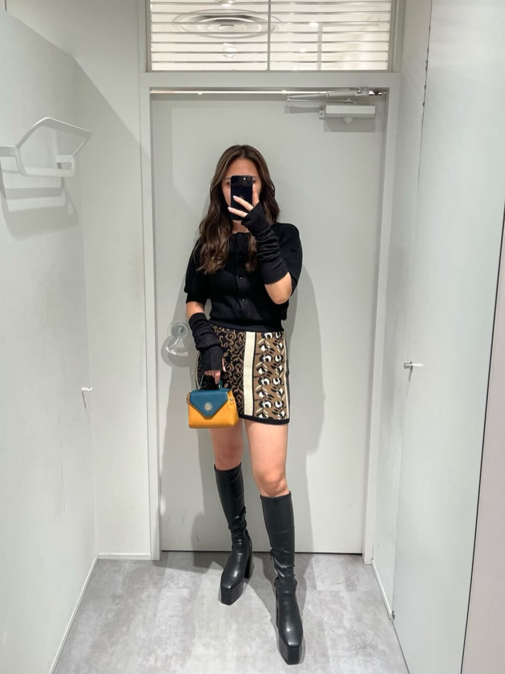 トレンドのアームウォーマーでEVRISコーデ♡ 【tops】トレンドのアームウォーマー付きのトップスは、肌触りふわふわで気持ちよく着心地抜群です◎インナーにタートルを入れたり、キャミに羽織ったりと、着回し次第で長い時期着れます✌︎【skirt】EVRISらしい柄のスカートは、生地感しっかりなので、ニットのタイトスカートですがインナー響きにくいです!フリーサイズですが、163cmの私でも着れる長さでした◎【boots】美脚効果抜群のミドルブーツ!履くだけでほんっとうに足盛れます♡しかも軽くて走れるぐらい歩きやすく、履き心地も満点です!!【bag】配色が可愛く、重くなりがちで差し色命な秋冬コーデにも馴染みやすい落ち着いた色味で使いやすいです!三つ折りのお財布だと充電器やリップも入れられました◎