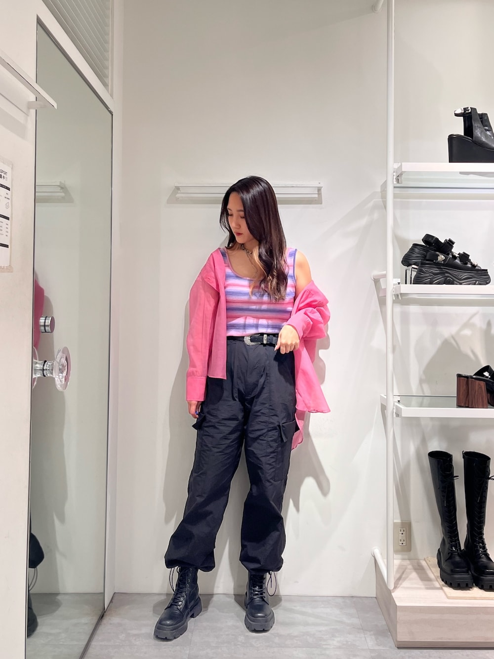 甘くならないピンクコーデ♡ 【シャツ】ゆるっとサイズで163cmでおしりまですっぽり隠れます◎透け感ある分派手すぎないのでカラー取り入れるのにオススメです✨【タンクトップ】トレンドのグラデーションデザインが可愛いです💕下着見えない形なのでインナー問題気にせず着れます🙆♀️【パンツ】トレンドのパラシュートパンツは、163cmで引きずらず履けるぐらいの丈感で、小柄さんは裾絞って履くのがおすすめです✔【ブーツ】23.5cm~24.0cmでMサイズ着用です。最近は夏コーデもブーツ合わせトレンドなので、オールシーズン使えるマストハブアイテム💯【ベルト】巻くだけで一気にオシャレ上級者に見えるEVRIS定番のベストセラーアイテム🌞ワンピなどにも合わせやすいので1本あると便利です✌️