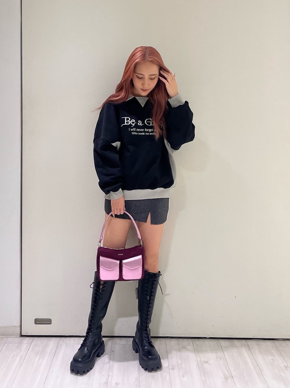 【TOPS】EVRISらしい刺繍が可愛く、着るだけで今期トレンドのスポーツMIXコーデか完成します✨ 【skirt】スリットデザイン×ラメ感で、スウェットコーデでもこれを合わせるだけで一気に華やかなレディライクなコーデに仕上がります◎インナー付きなので高身長でも安心して着用できます。 【bag】モノトーンコーデの差し色におすすめです🩷 【boots】23.5cmでMサイズ着用です。