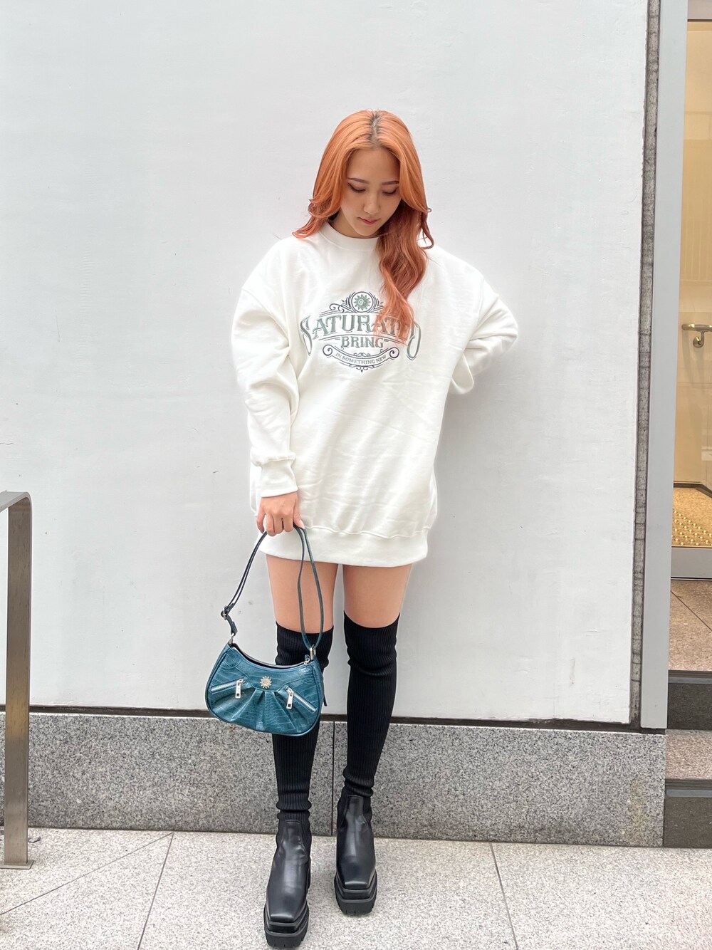 【トレーナー】裏起毛で冬まで暖かく着れます❄️EVRISのサニーモチーフ入りの刺繍が可愛い🌞163cmでワンピース風に着れるサイズ感です🙆♀️ 【BAG】見た目小さいですが、マチがあるタイプなので、小さいペットボトルなら入れていただけます◎ 【ブーツ】23.5cmでMサイズ着用です。