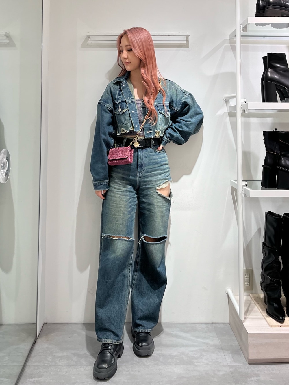 春の必需品デニムセットアップ🩵 【アウター】切りっぱなしと首元のベルトが個性はデザインで可愛いです🫶 【パンツ】ハイウエストなので、ショート丈のGジャンとセットアップで着ると脚長効果抜群です🙆♀️ダメージは開きすぎないので、下着は気にせず着て頂けます。 【インナー】シャギー×ラメで今年っぽさ◎セットのカーディガンとの合せも可愛いです✨ 【BAG】サニーのチャーム取り外せます🌞中がそのままお財布として使えるので、ちょっとお出かけしたい時に便利☑️