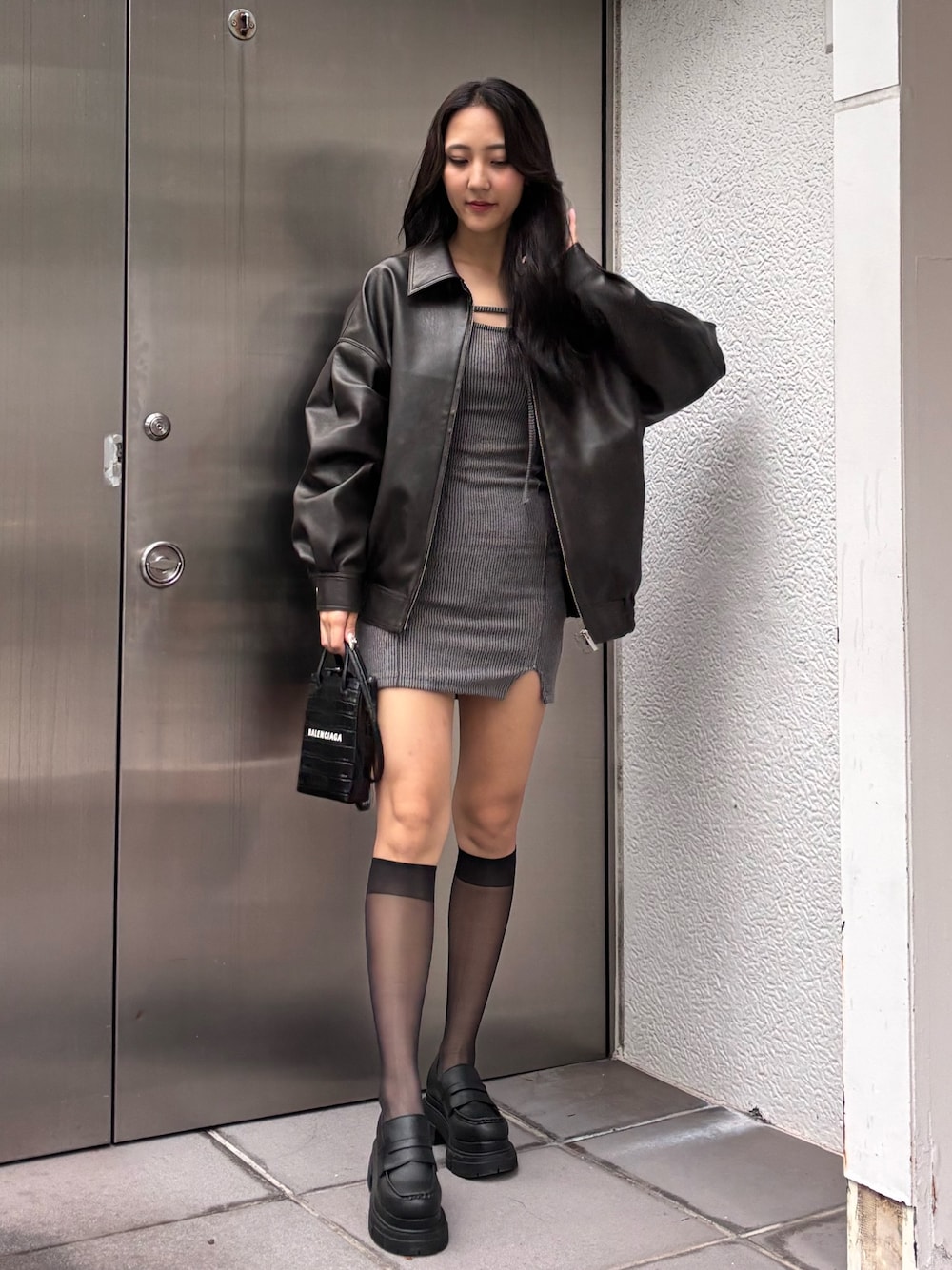 【ブルゾン】EVRIS定番のフェイクレザーブルゾンは、ゆるっとシルエットで着るだけで可愛く♡163cmで少しおしり隠れる丈感です◎風通さず、オーバーサイズで中に着込めるので冬まで大活躍✓ 【ワンピース】高身長でも着やすい丈感で、袖が少し長めで袖先に溜まるのが今っぽくて可愛い🫶胸元も開きすぎないので、露出苦手な方にもおすすめです◎ 【シューズ】23.5cm/Mサイズ着用です。厚底でとにかく盛れる神シューズ✨シーズンレスに履けるので持っておくとスタメン入り間違いなしです!