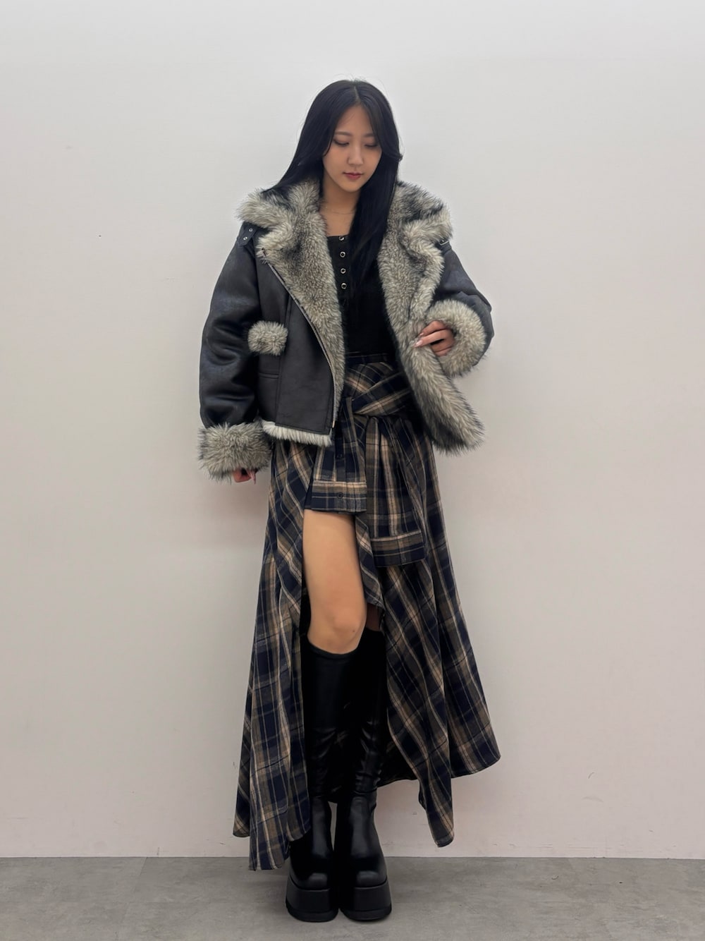 【アウター】両面使える2倍可愛いリバーシブルブルゾン♡EVRIS定番のムートンブルゾンが今期トレンドのファーアウターとしても使えるように!ボリューム感あって高見えするのに重くなく羽織りやすい1着で、今年の冬マストな主役アイテム! 【トップス】アウターのインナーにも使いやすいオフショルデザイン♡ふわふわのモール素材で着心地も抜群◎ 【スカート】トレンドのチェックスカートは、スリット入りなので、ロングスカートでも肌見せできて小柄さんや、ロングスカート普段履かない方にもおすすめです!ロングブーツ合わせがこなれ感出ておすすめ︎︎︎︎︎︎☑︎ 【ブーツ】履くだけで盛れると話題の"秒盛れブーツ" 23.5cmでMサイズ着用です! この冬EVRISで大人気のアイテムを詰め込んだトレンドコーデ♡デイリー使いはもちろん、お出かけにもおすすめです!