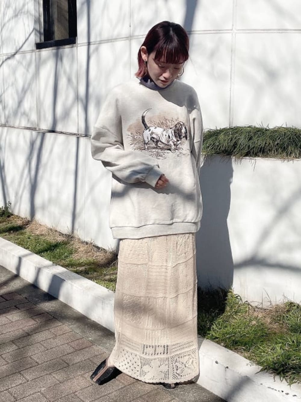 ルーズなサイズ感のスウェットを主役にしたカジュアルコーデ。 犬の絵がプリントされたヴィンテージなスウェット。 メッシュトップスをレイヤードしてこなれ感を。 すっきりシルエットのニットスカートを合わせれば、スタイルアップ効果も◎ 透かし柄が春らしい印象に。