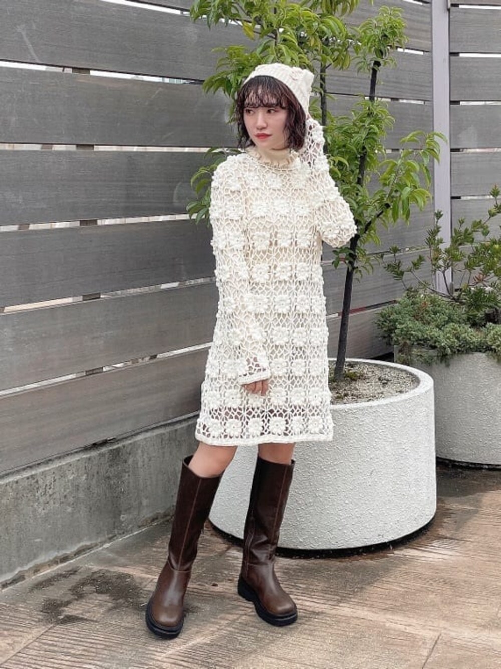 ぽこぽこと立体的なお花がポイントのニットワンピース。 ざっくりと編まれているので、カットソーやキャミソールなどのレイヤードも楽しめます! 体に添うシルエットなのでスタイルアップ効果も◎ アイボリーのリブニットとショートパンツを合わせてホワイトコーデにしました♡ 足元にはブラウンのブーツを選ぶとパキッと引き締まった印象に。