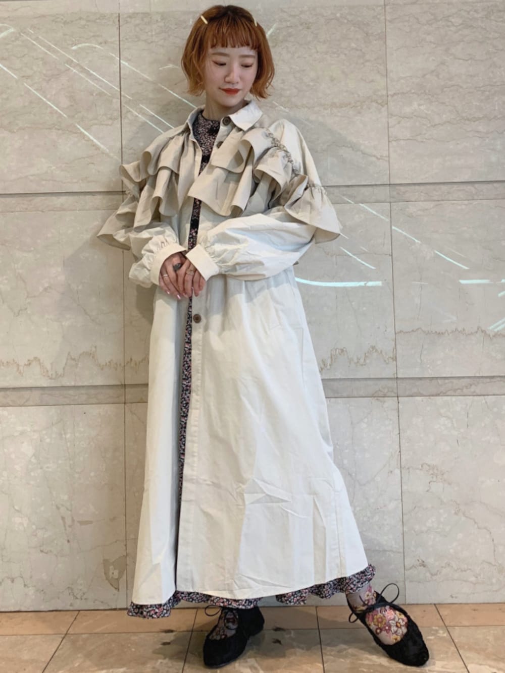 たっぷりのフリルがついたトレンチコート!merryjennyらしいデザインで周りと差をつける一着です。スッキリとしたシルエットで甘すぎず着ていただけます♡シンプルな色味のアウターには、春らしい小花柄のワンピースを合わせました。merryjennyで人気シリーズのチャイナワンピース!スッキリとしたスタンドカラーで子供っぽくならず1枚で華やかになるワンピースです。ウエストの切り替えが上の方にあるのでスタイルUP効果も◎トレンチ×ロングワンピで大人merryコーデですが、ヘアピンアレンジでメリーらしさを取り入れ、甘さをプラスしました。