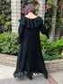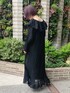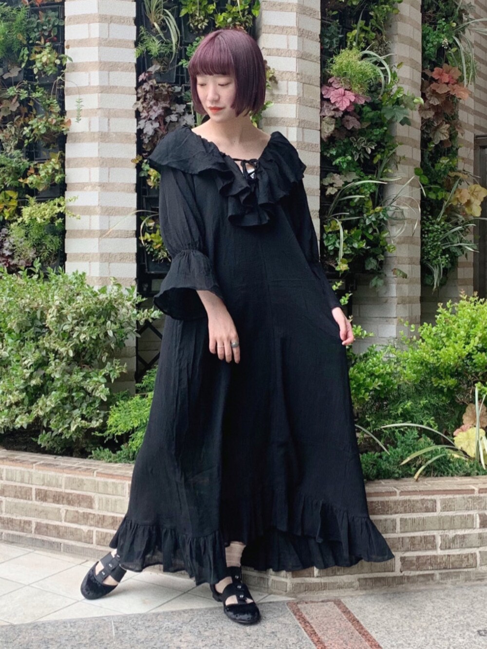 夏に大活躍するおすすめワンピ♡ フリルがたくさんついたガーリーなワンピースですが、モノトーンで可愛すぎないコーデにしました! 大人merryさんにおすすめです。 首周りにはたくさんのフリルが施されていて顔周りが華やかに見えます♡ 深めのV開きデザインなので鎖骨が綺麗に見え、女性らしさも◎ てろんっとした透け感のあるワンピースなのでブラックでも重たくならずに着ていただけます。 夏場、やけたくない方にもおすすめ! キャミソールペチコートもついているので、インナーに悩む心配なし! ワンピースがロング丈なので、シューズは足の甲が見えるスッキリとした物を選びました。 写真のようなレースソックスを覗かせたり、素足でも履いていただけます!