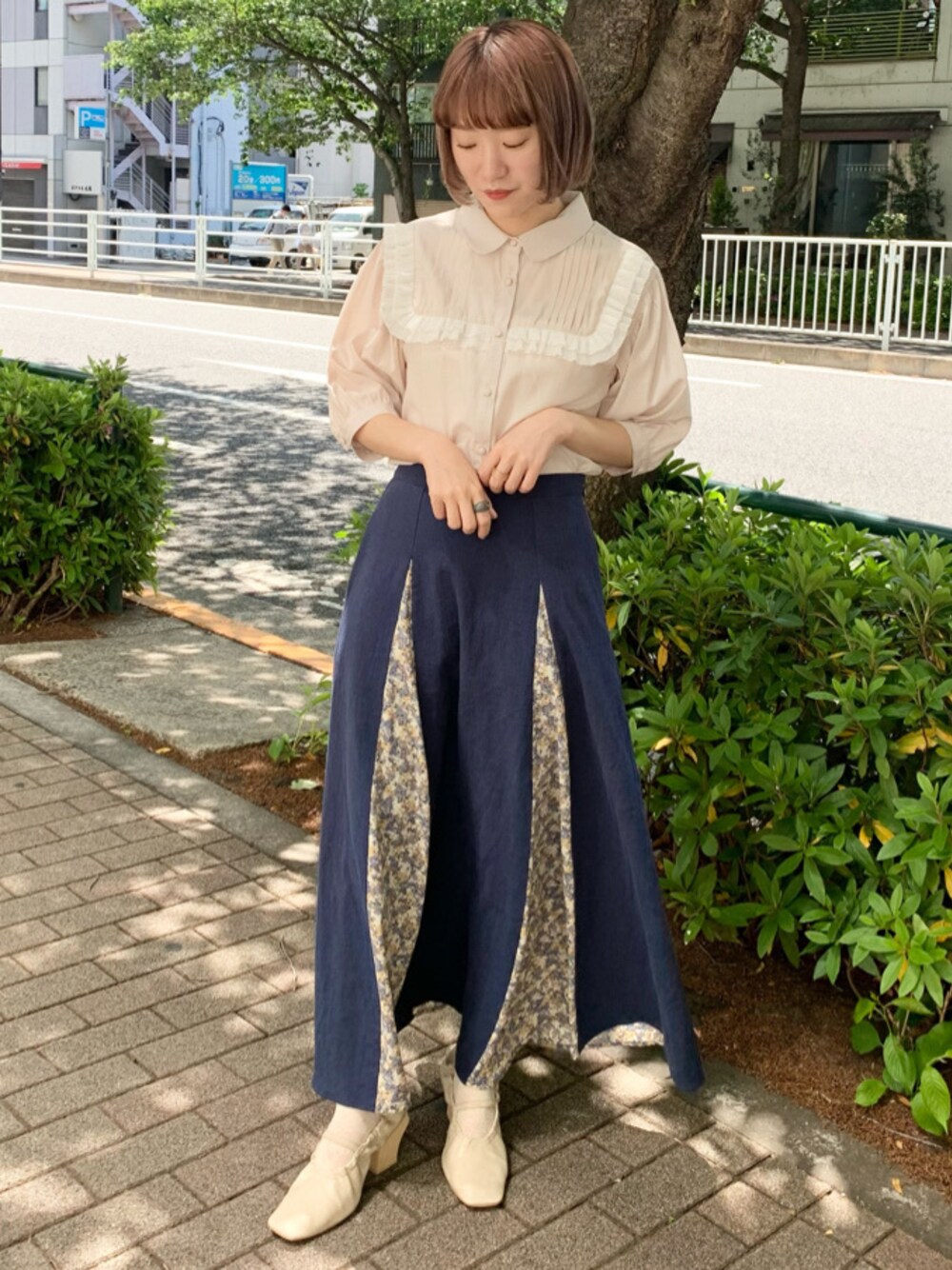 花柄の切り替えがポイントのロングスカートを主役にした大人ガーリーコーデ♡ 歩く度揺れて花柄がちらっと見える可愛いデザインのスカートです。 綿素材なので夏でも通気性◎ ブラウスやTシャツとトップスを選ばないので普段使いにピッタリ! ヒールを合わせれば大人っぽく着ていただけます。 ブラウスはツヤのある薄手生地を使用していて暑い夏でも大活躍! 華やかなデザインなので写真映えすること間違いなし♡ スカートが目立つようにシューズは落ち着いた色味のものを選びました。ユニークなデザインのウッドヒールで足元までオシャレに♡