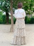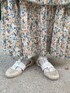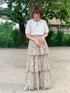 甘めガーリーコーデ♡ 大きめの襟がとびっきりガーリーなブラウス! パフスリーブなので腕を細く見せてくれます。 シンプルなブラウスはどんなボトムも合わせやすく1枚持っていればコーディネートの幅も広がります! 私は華やかなスカートを合わせて夏らしく。 小花柄とふわっとしたティアードスカートの組み合わせは、ガーリーさんにはたまらないアイテム♡ ウエストはゴムなので着心地も楽ちんです! 153cmの私でもフラットシューズで履ける丈感です。 シューズはスカートと合わせてベージュをチョイス。 きらきらとした箔がより夏らしい印象にしてくれます!