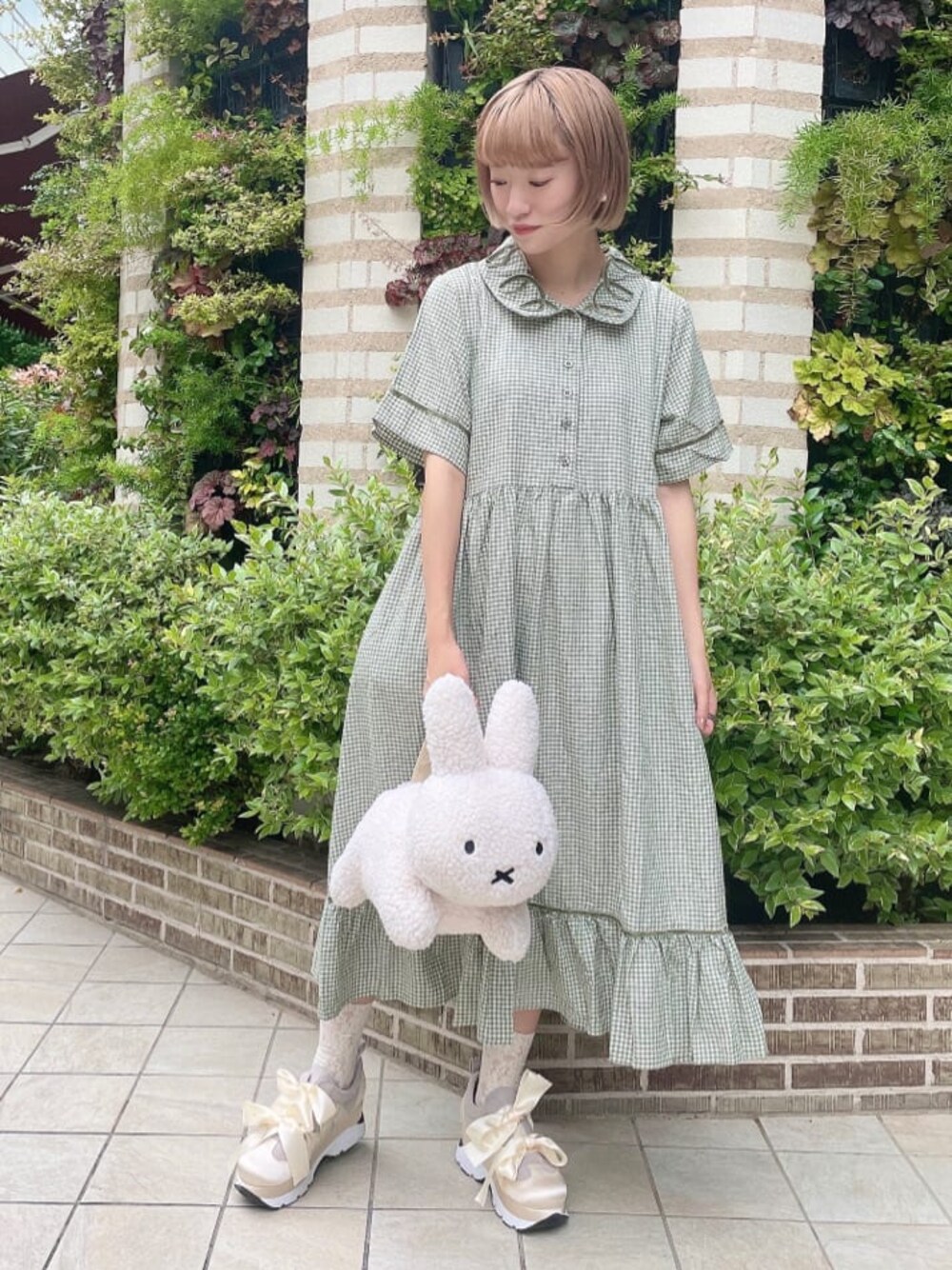 おすすめガーリーコーデ♡ 襟にあしらったベロアのテープがポイントのワンピース。 ゆったりシルエットでボディラインを気にせずに着ていただけます! ウエストの切り替え位置も高めに設定しているのでスタイルアップ効果も◎ みんな大好きうさぎさんのバッグを合わせてみました。 ぬいぐるみのようですが実は…バッグです! お荷物も入るので、一緒におでかけに連れて行ってあげてください♡