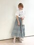 おすすめのカジュアルコーデ♡ ルーズなサイズ感のTシャツにボリュームのあるフレアスカートを合わせました。 カジュアルになりがちなTシャツも、ふんわりシルエットのスカートを合わせることでガーリーさをプラス! スカートのウエストはゴムになっているので履き心地も◎