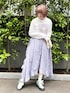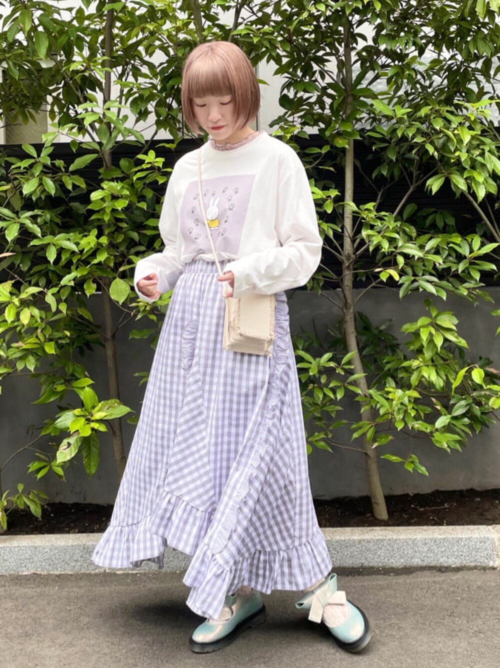 お花畑にいるmiffyがチャーミングなロンT♡ プリントのラベンダーとスカートも色味を合わせて淡色コーデに。 スカートもアシンメトリーなデザインで動く度、違う表情を見せてくれます♡ ハッピーで着るだけで楽しいコーディネートにしました!