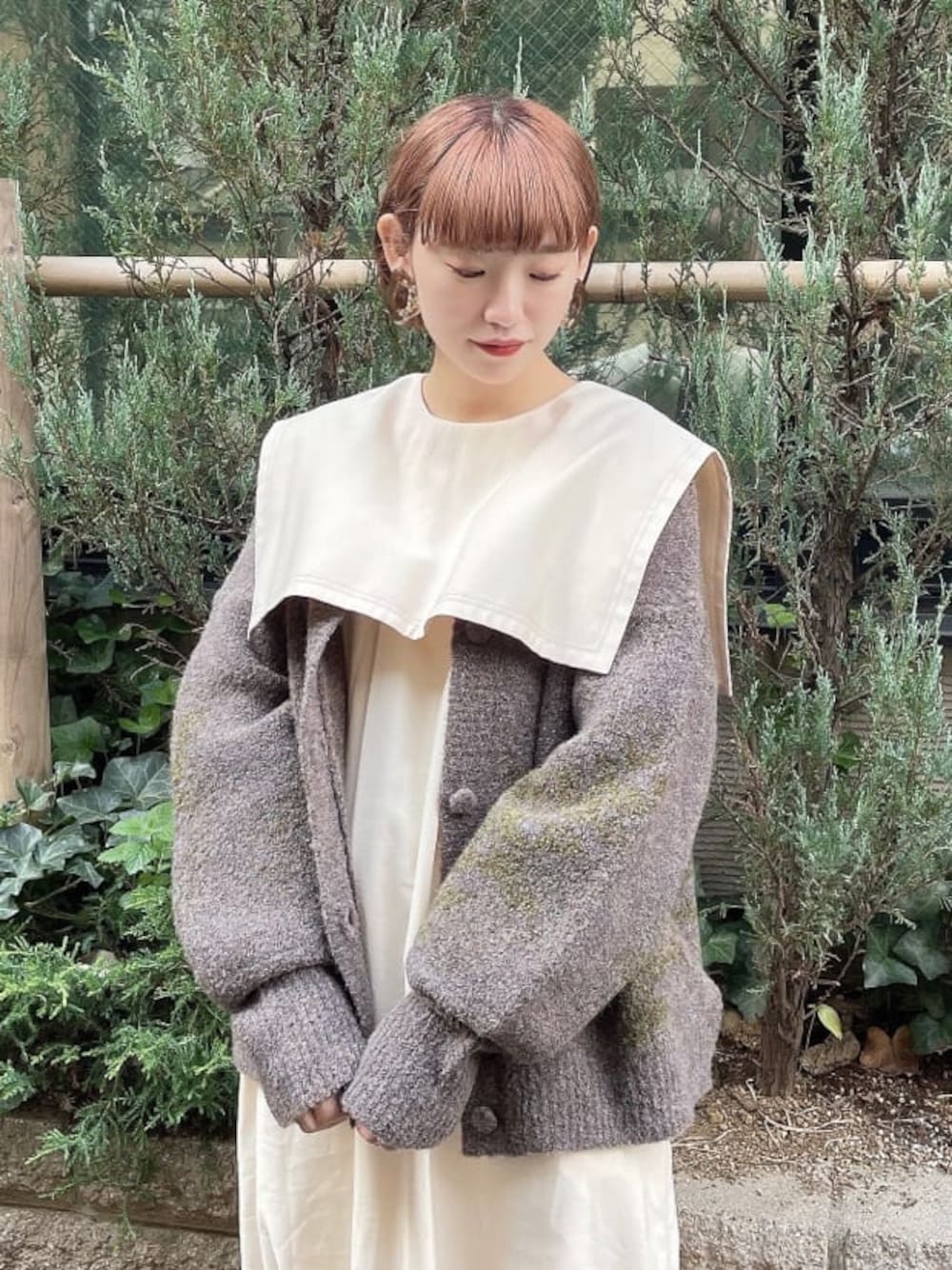 大人カジュアルなコーディネート。 大きなセーラーカラーと配色ステッチがポイントのワンピース! 体のラインが出ないシルエットで締め付け感なく着心地も◎ ボリューム感たっぷりのニットカーディガンをさらっと羽織れば、寒い日も安心です♡