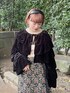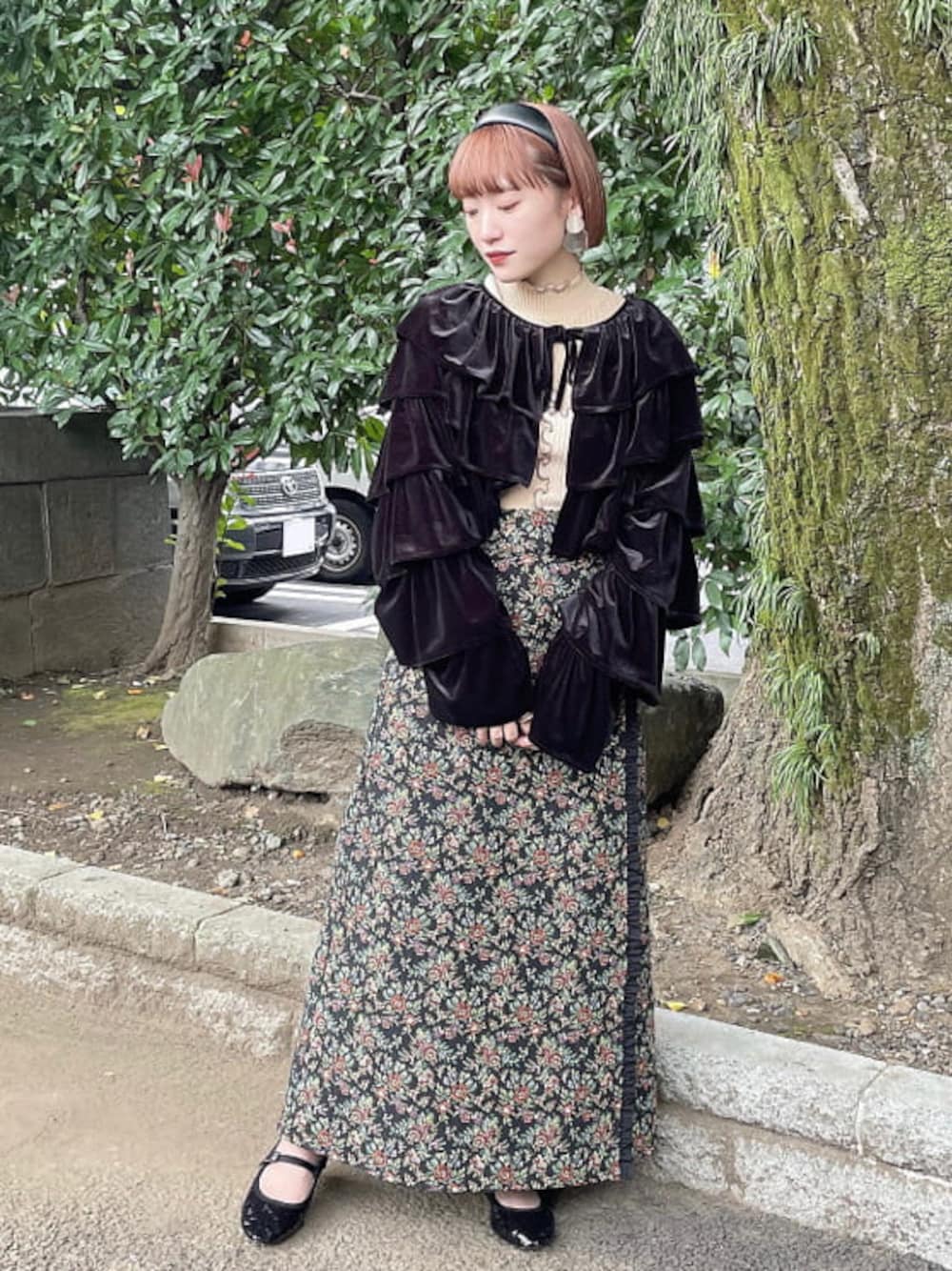 モノトーンコーデ♡ たっぷりのフリルがついたベロアカーディガン。 光沢感もあり、上品な印象に。 ショート丈なのでスタイルUP効果抜群! スッキリとしたボトムと合わせるのがおすすめ。 今回は華やかなジャガード生地のスカートと合わせました。 小物はブラックで合わせて統一感を。