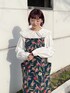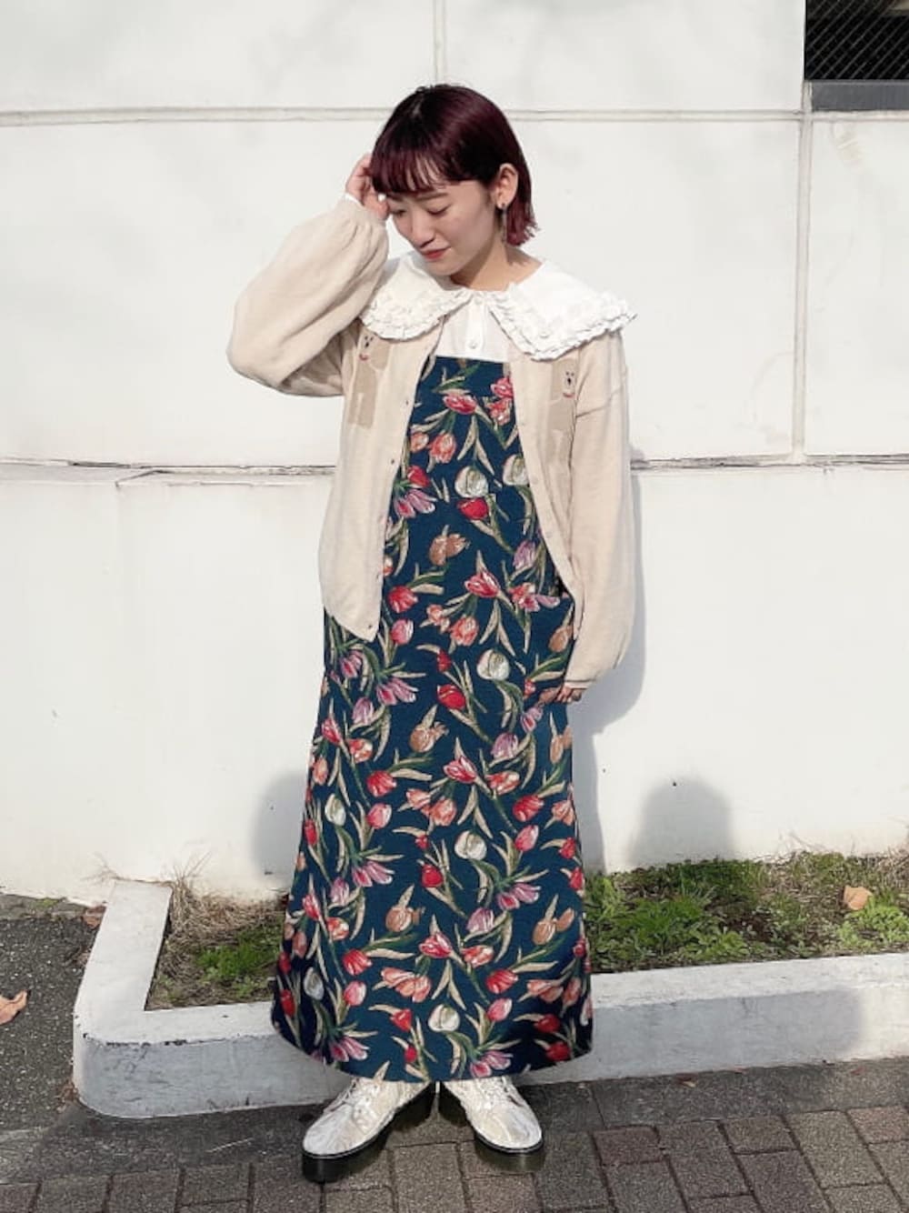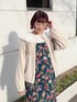 春のガーリーコーデ♡ ネイビーにカラフルなチューリップが印象的なジャンスカはコーデをぱっと華やかにしてくれます! フリルがたっぷりな丸襟ブラウスと合わせてもガーリーに♡ ブラウス1枚で肌寒い日にはガーディガンを羽織るのがおすすめ!