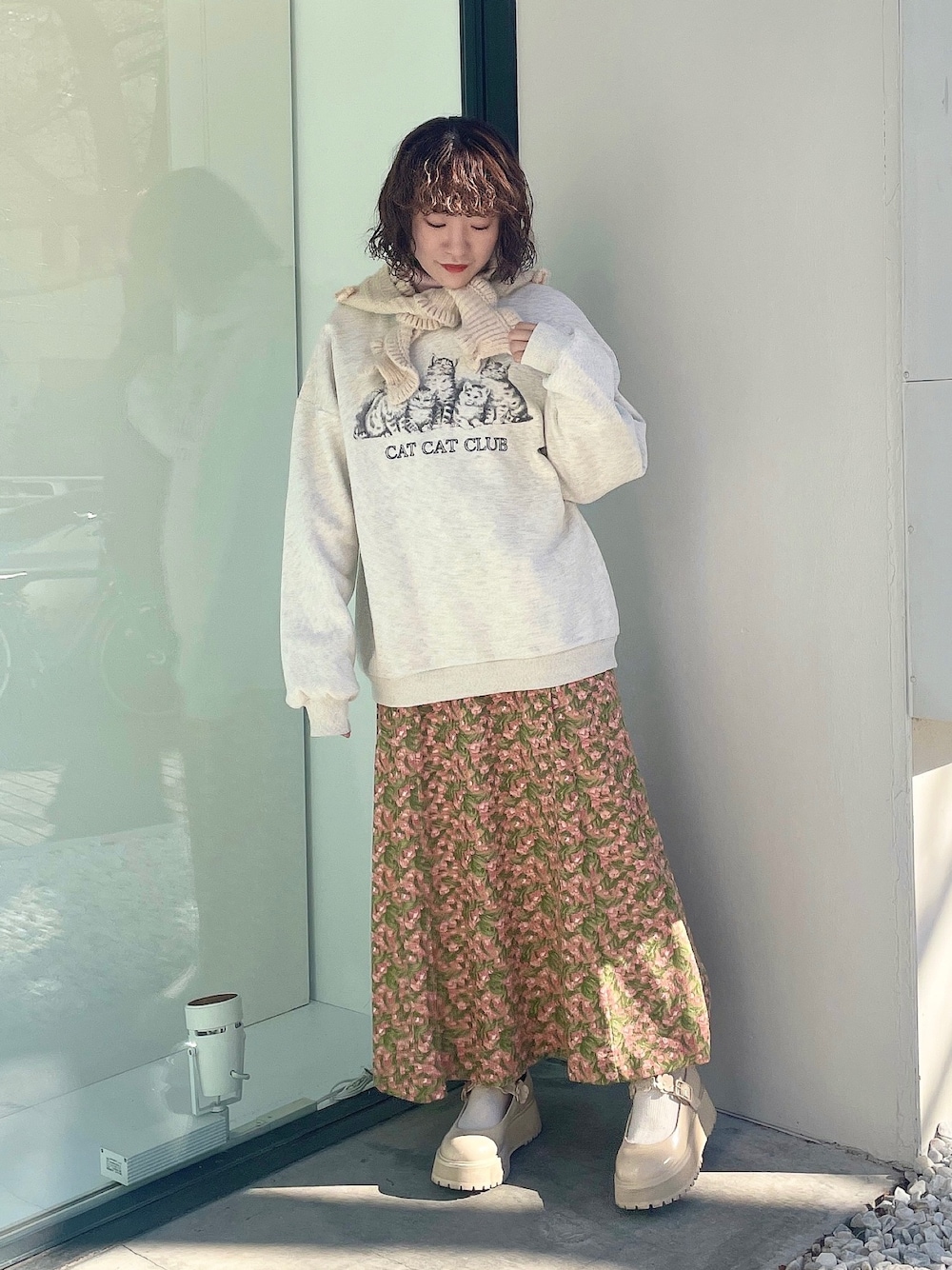 裏起毛素材のスウェットトレーナーは寒い冬にぴったり! シンプルなトレーナーなので柄ワンピを合わせて華やかなコーデに。 バラクラバ合わせでトレンド感◎