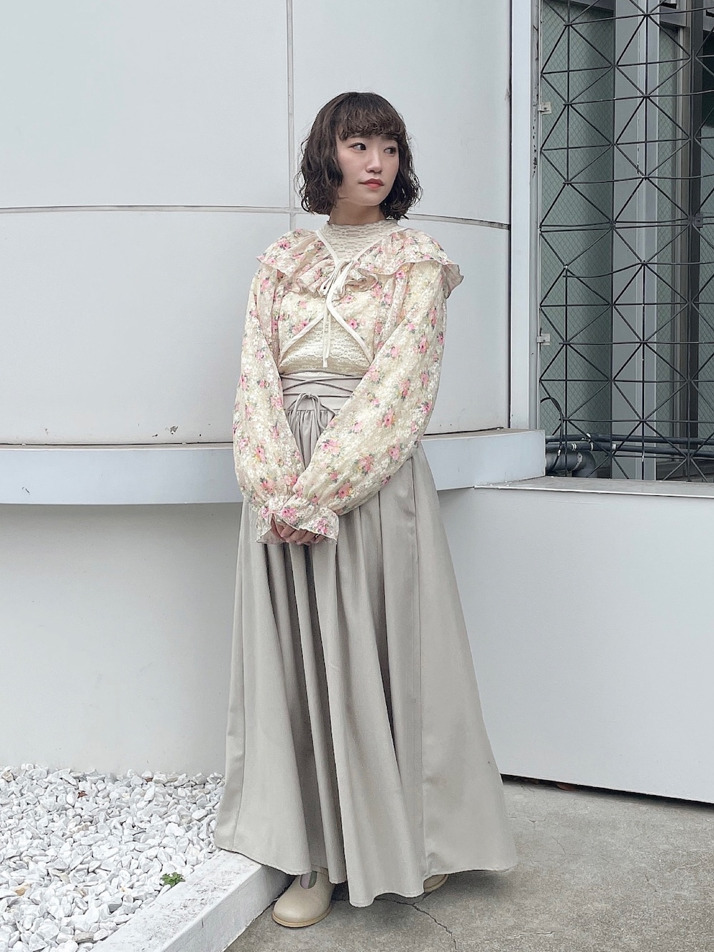 フリル、リボンなど可愛いが詰まった花柄のボレロ♡ たっぷりのギャザーを寄せたボリュームスリーブは体型カバーにも◎ ショート丈なのでスタイルアップ効果にもなりますよ! スカートはシンプルだけどウエスト部分にデザインのあるものを選び大人っぽいコーデに。