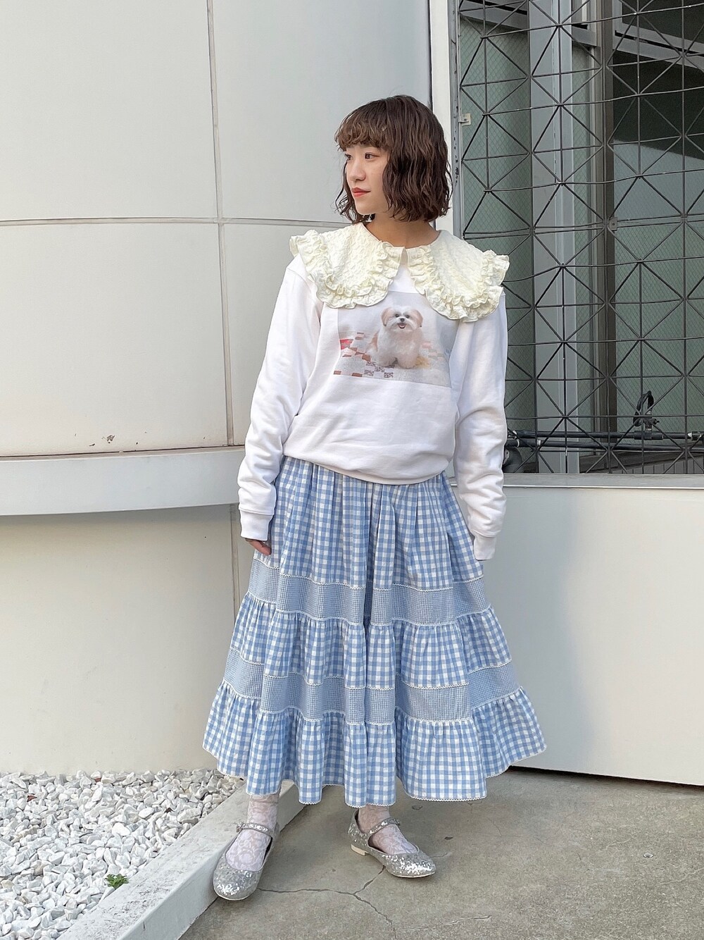 大人気のモコゾウコラボアイテムを使ったガーリーコーデ♡ トレーナーに大きめの襟がついたトップスをレイヤードして甘めなコーデにしました! ふわっと広がるブルーのスカートを合わせれば春らしい華やかなコーデに。