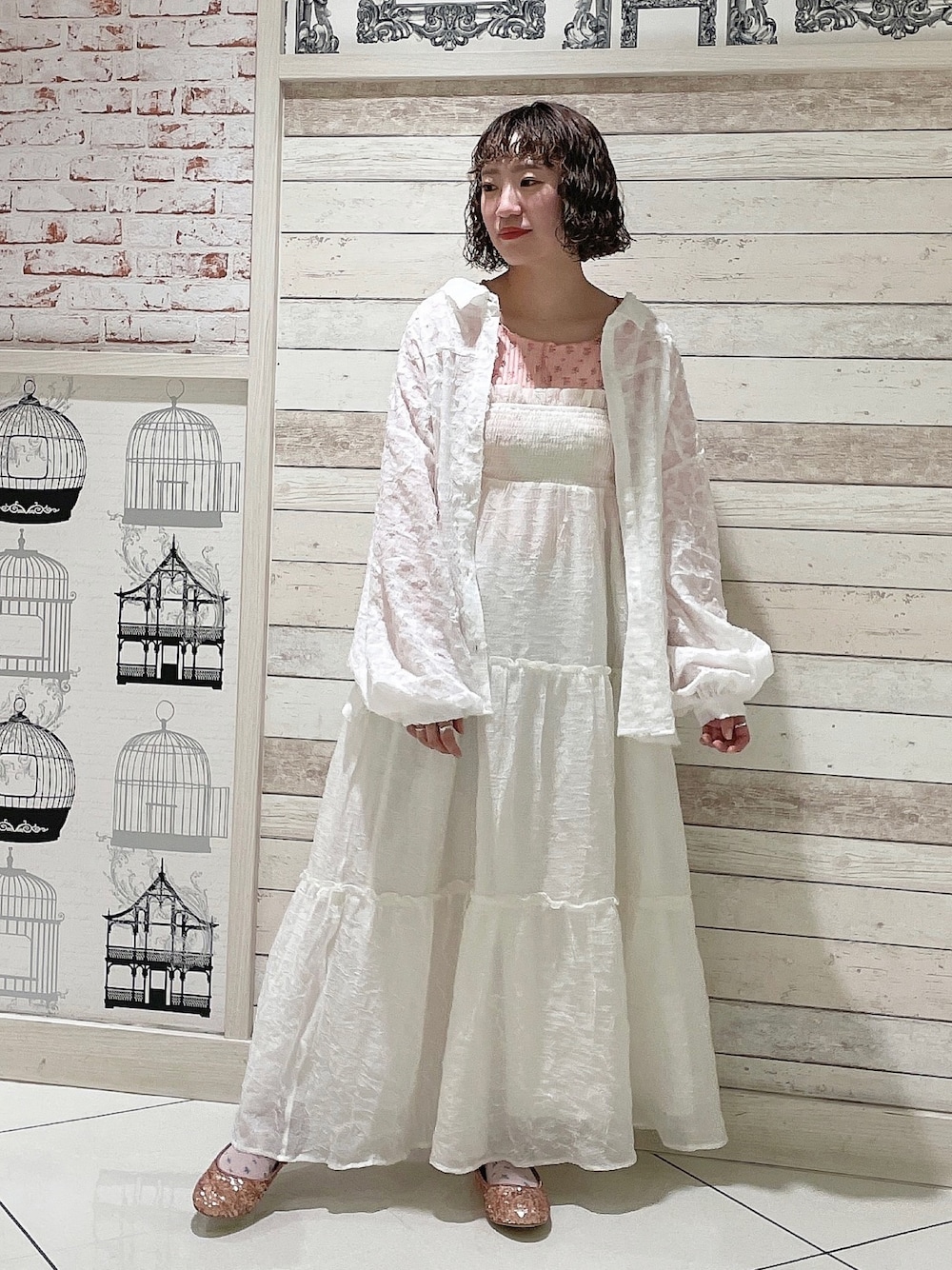 キャミワンピースは胸元のシャーリングがフェミニンでふわっとボリュームたっぷりなアイテム♡ 肩紐で長さ調節ができるので、低身長さんにもおすすめ! 春らしく花柄のトップスを合わせました。 肌寒い日にはサラッとビッグシャツを羽織るのもおすすめ!