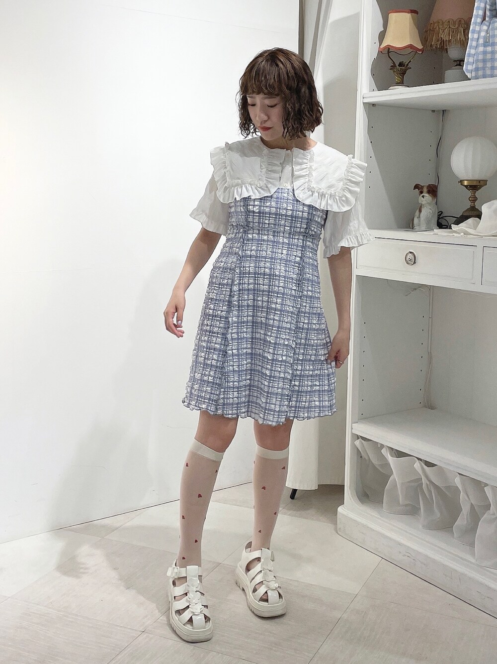 ワンピースは肩紐で丈の調節ができるのでどんな身長でも可愛く着こなせます♡ すっきりとしたシルエットで着痩せ効果も◎ ブルーのワンピースに白ブラウスを合わせると、爽やかな夏コーデに!