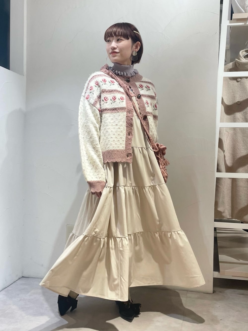 お花柄のニットカーディガンは色鮮やかで、顔周りをぱっと華やかにしてくれます。 キャミワンピースは肩紐のリボンがポイントで、丈感も調節出来るので低身長さんにもオススメです! シーズン問わず着ることが出来る素材感なので着回し抜群アイテム。 立体的なお花や葉っぱがポイントのニットポシェット。 ショルダーストラップはリボンになっていて好きな長さに調節できます!