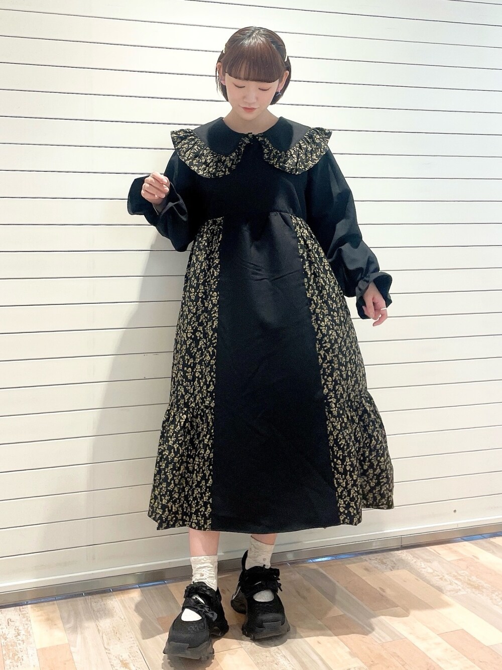 大きめの襟がポイントのワンピース。 お花柄のフリルが顔周りを華やかにしてくれます。 ふわっと広がるデザインで体のラインを拾わず、着心地も◎ スニーカーは軽くて歩きやすいので長時間歩く日でも疲れにくいです! 厚底ソールでスタイルアップも◎