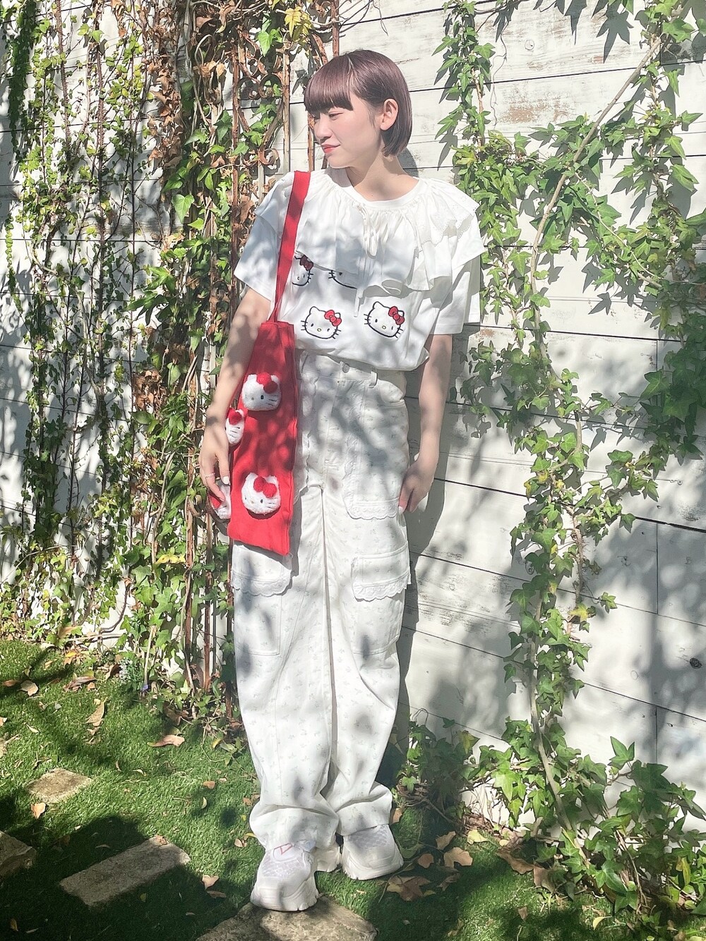 ハローキティ×merry jennyのコラボレーションアイテム♡ Tシャツはゆったりとしたサイズ感で着心地も○ カジュアルに花柄のパンツ合わせにしました! つけ襟としても使えるサッシュをプラスすれば個性的なコーディネートに。 厚底のスニーカーを合わせればスタイルアップ効果○