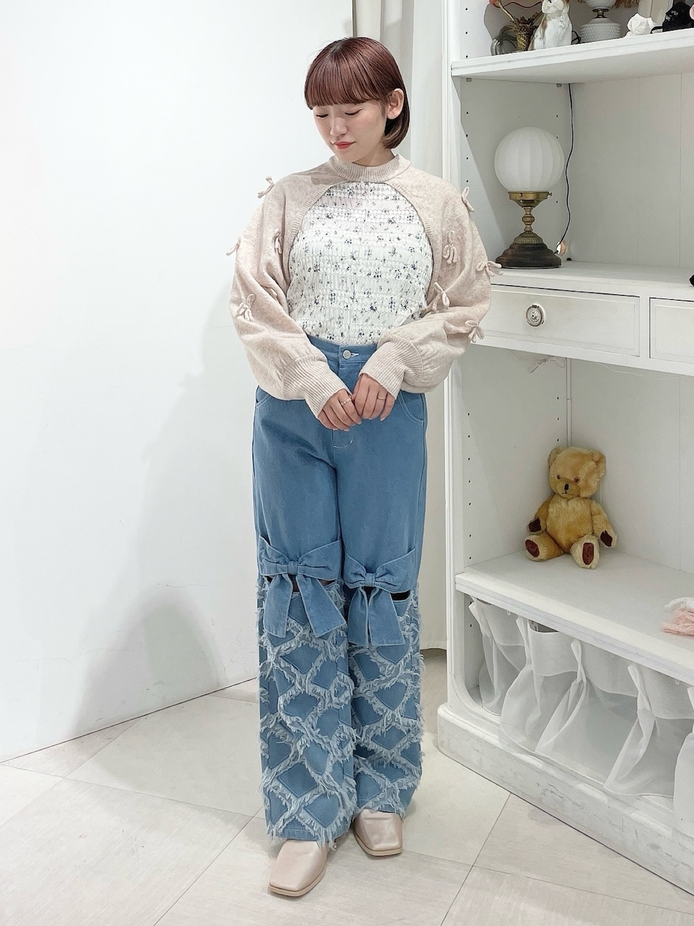 アクセサリー感覚のボレロのようなスリーブはたくさんのリボンがポイント。 つい触りたくなるようなふわふわ柔らかなニットです♡ パンツと合わせればスタイルアップ効果◎ ひざ部分の大きなリボンが個性的なデニムパンツ。 リボンの下はカットアウト仕様でトレンド感のあるアイテムです! フリンジデニム生地も使用しているので一気にオシャレ見えします。