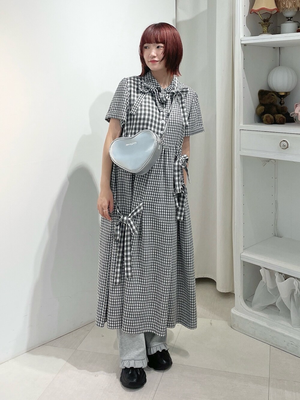 たくさんリボンのついたガーリーなワンピース♡ ランダムなチェック柄で華やかな印象に。 体のラインをひろわないシルエットで着心地も◎ 低身長さんにもおすすめの丈感です! パンツをレイヤードしてカジュアルダウン。 裾のフリルがちらっと見えてコーディネートのアクセントに♡ 伸縮性があり着心地も○ 厚底のスニーカーは軽く柔らかい素材感で長時間履いていても疲れずおすすめ! スタイルアップ効果も期待できます。