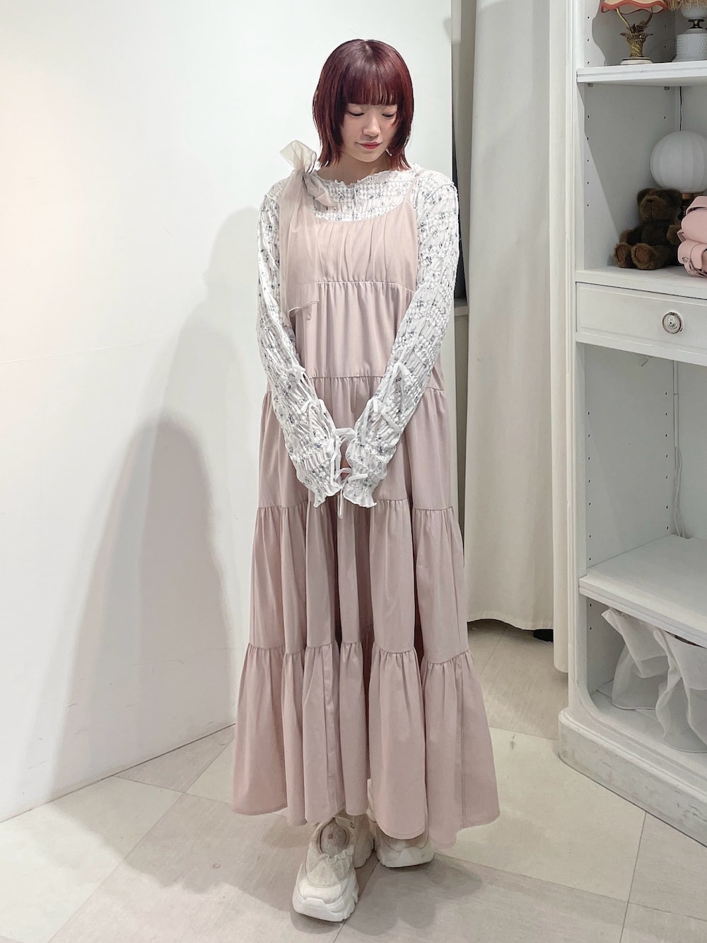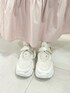 肩に乗った大きなチュールリボンがpointのキャミワンピース。 着丈は後ろのアジャスターで調節ができるので低身長さんにもおすすめ! 花柄のトップスはお袖のリボンがポイント! 首周りが広めにあいているので首もとがすっきりして見えます。 スニーカーはレースやサテン生地を組み合わせた豪華なアイテム! 厚底ソールでスタイルアップ効果はもちろん、長時間のお出かけにも重宝します。