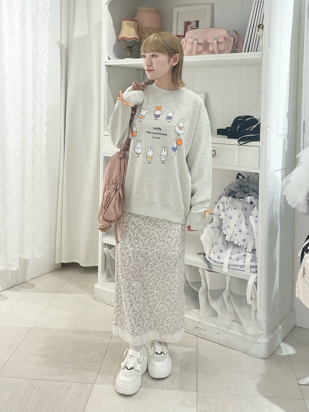 miffy ×merry jenny コラボレーションアイテム♡ miffyの70周年をお祝いした特別なトレーナーが登場! 年代別のmiffyが並んだ目を引くスウェット♡ 袖のリボンもポイントです! ルーズなサイズ感でレイヤードもしやすいアイテムです。 すっきりとしたストレートシルエットのロングスカート。 レーステープがコーディネートのアクセントに! とろんとした生地感で着心地も◎ お花が咲いたメッシュスニーカーは、ガーリーなデザインですがメッシュ素材なので甘すぎないアイテムです。 厚底なのでスタイルアップ効果も◎