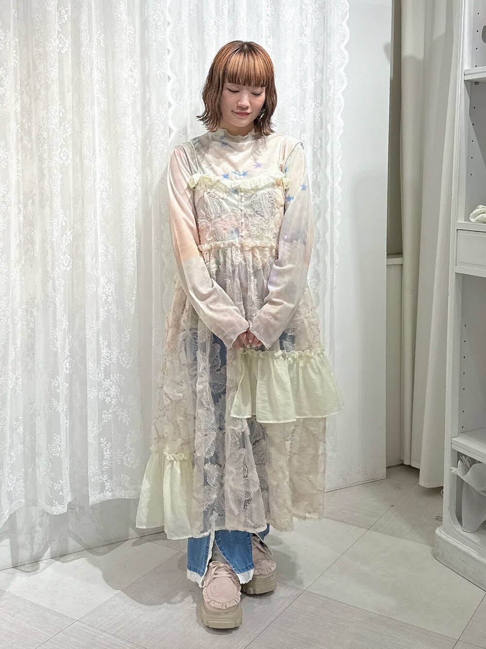 スパンコールを全面にあしらった華やかなレイヤードワンピース。 ふわっと広がるシルエットで特別感のあるアイテムです! インナーにはメッシュ生地にプリントを乗せたシアートップスを合わせました。 カラフルな色合いがシンプルなワンピースと合わせれば華やかなコーディネートにしてくれます! デニムパンツは細身ですが伸縮性があるので動きやすく、すっきりとした印象に。 レースとリボンでカジュアルなアイテムをガーリーに楽しんでいただけます。 ローファーはフリルやリボンの刺繍がポイント! 厚底なのでスタイルアップ効果も◎