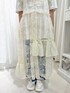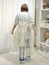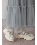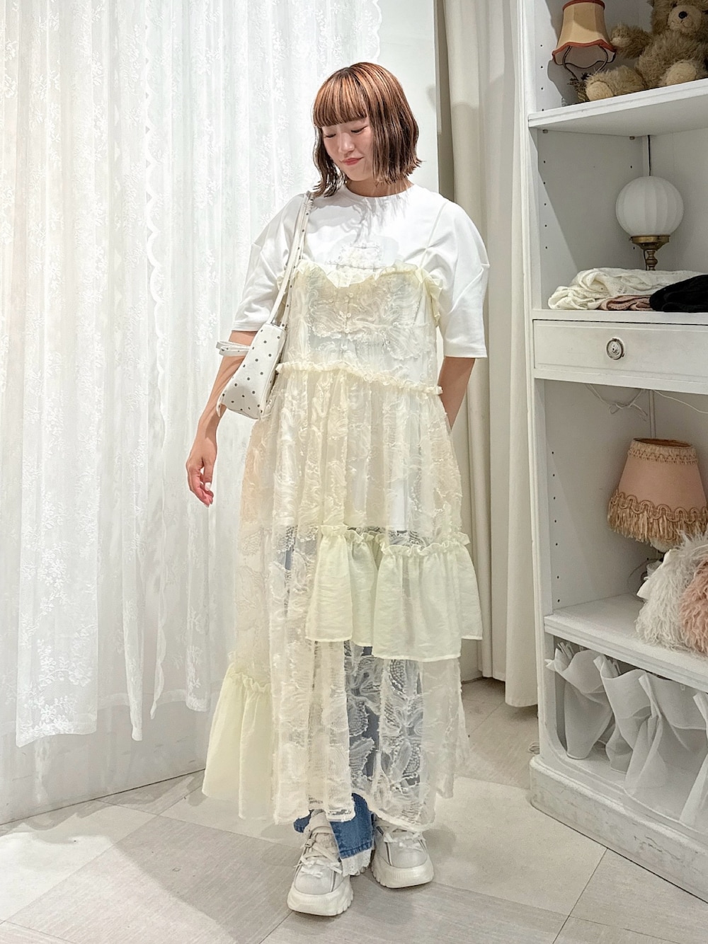 スパンコールを全面にあしらった華やかなレイヤードワンピース。 ふわっと広がるシルエットで特別感のあるアイテムです! 丈感の調整もできるのでどんな身長の方にも着ていただけます! Tシャツはぬいぐるみが夢を見ながらお布団で寝ているようなデザイン♡ ゆったりとしたサイズ感で着心地も◎ デニムパンツは細身ですが伸縮性があるので動きやすく、すっきりとした印象に。 レースとリボンでカジュアルなアイテムをガーリーに楽しんでいただけます。 シューズはバレエシューズのようなデザインですが、スニーカーソールなので歩きやすさ◎ リボン、ジャガード、メッシュの組み合わせが特別感のあるアイテムです♡